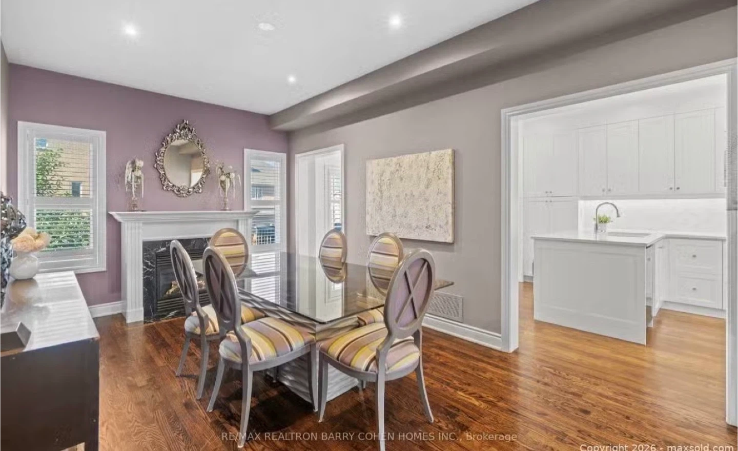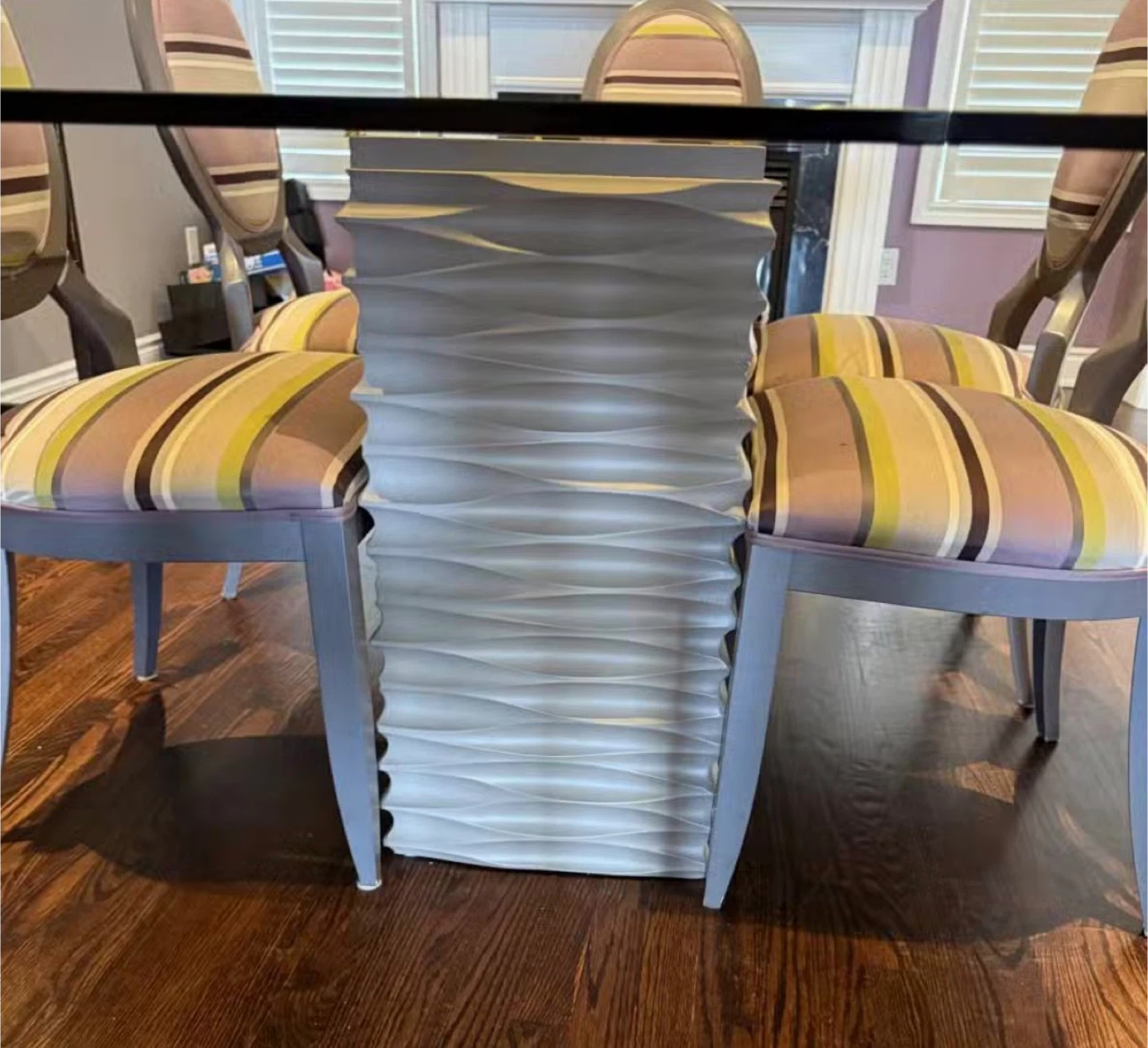This is a glass-top dining table with a unique carved base. It comes with six matching chairs upholstered in a colourful striped fabric. The chairs have grey frames and oval backs. A beautiful set for your dining room!