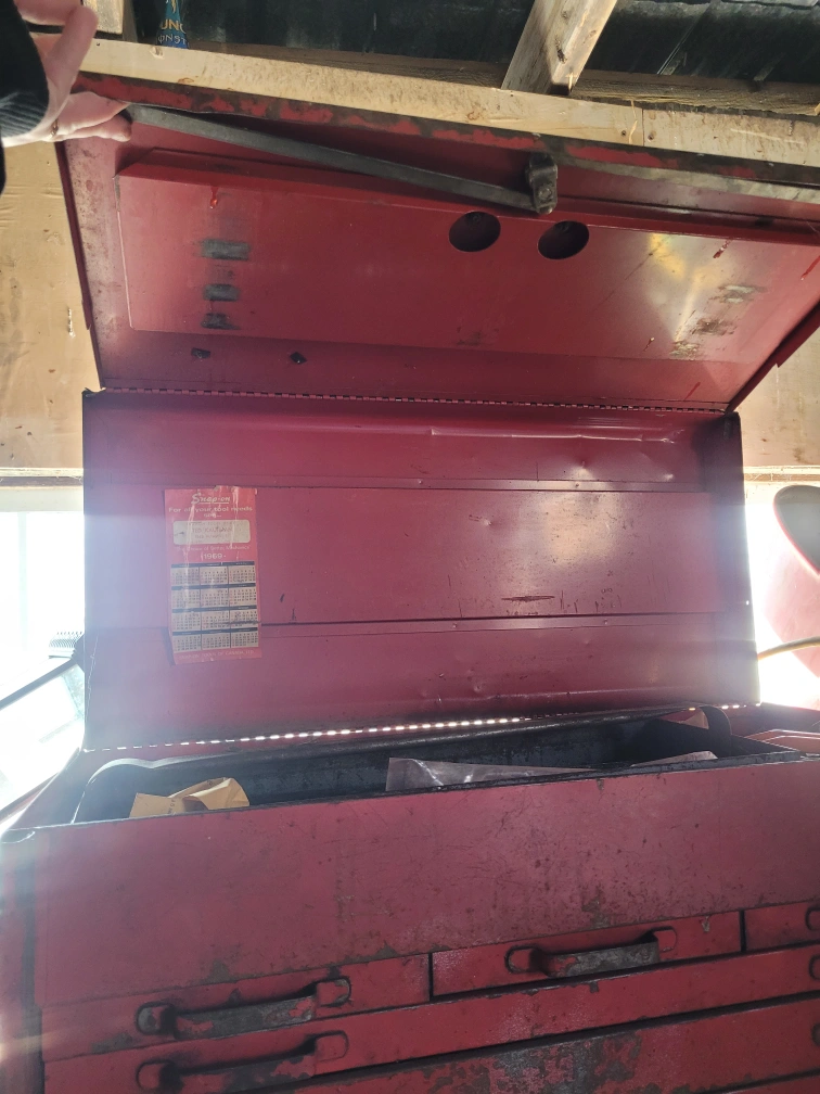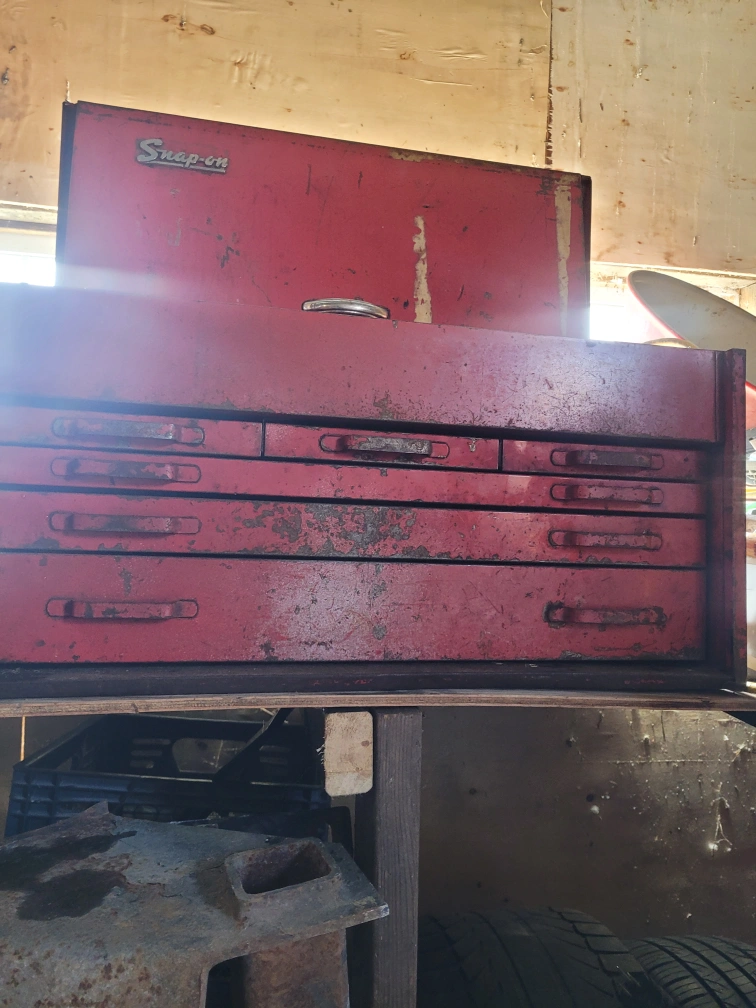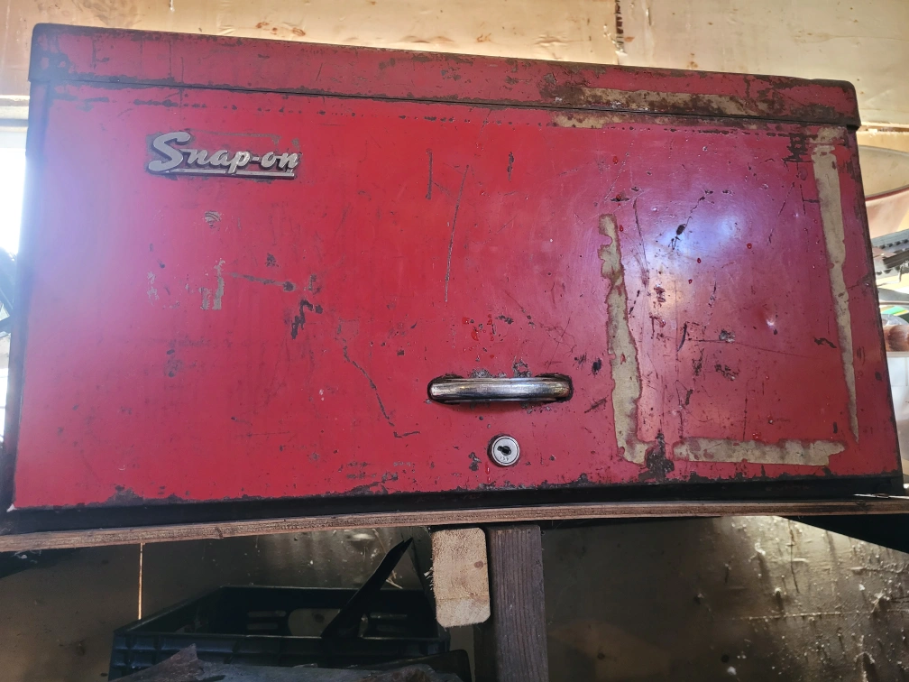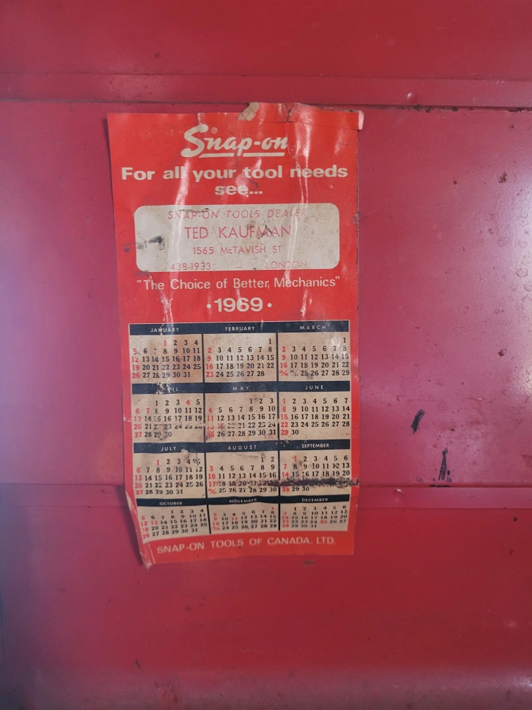 Red metal toolbox. Multiple drawers. Shows wear consistent with age. Includes a 1969 Snap-on calendar.