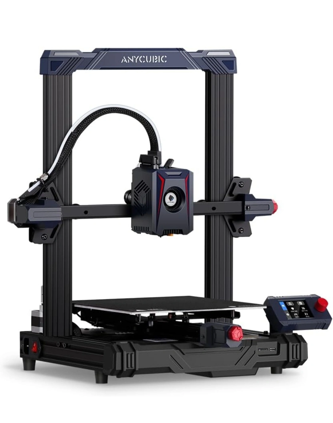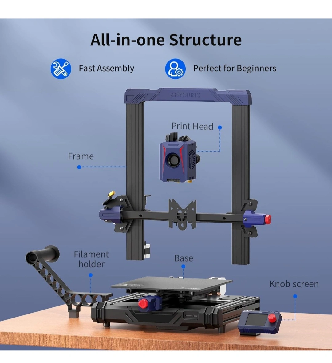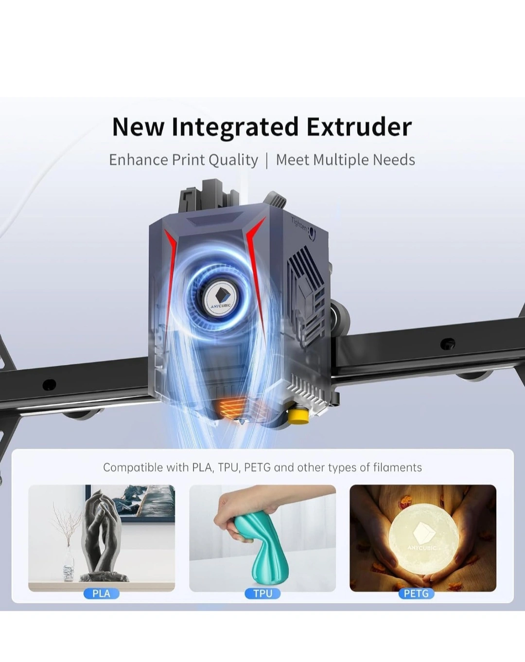 3D printer with auto-levelling and new integrated extruder. Fast assembly, perfect for beginners. Compatible with PLA, TPU, PETG filaments. Includes a knob screen and filament holder.