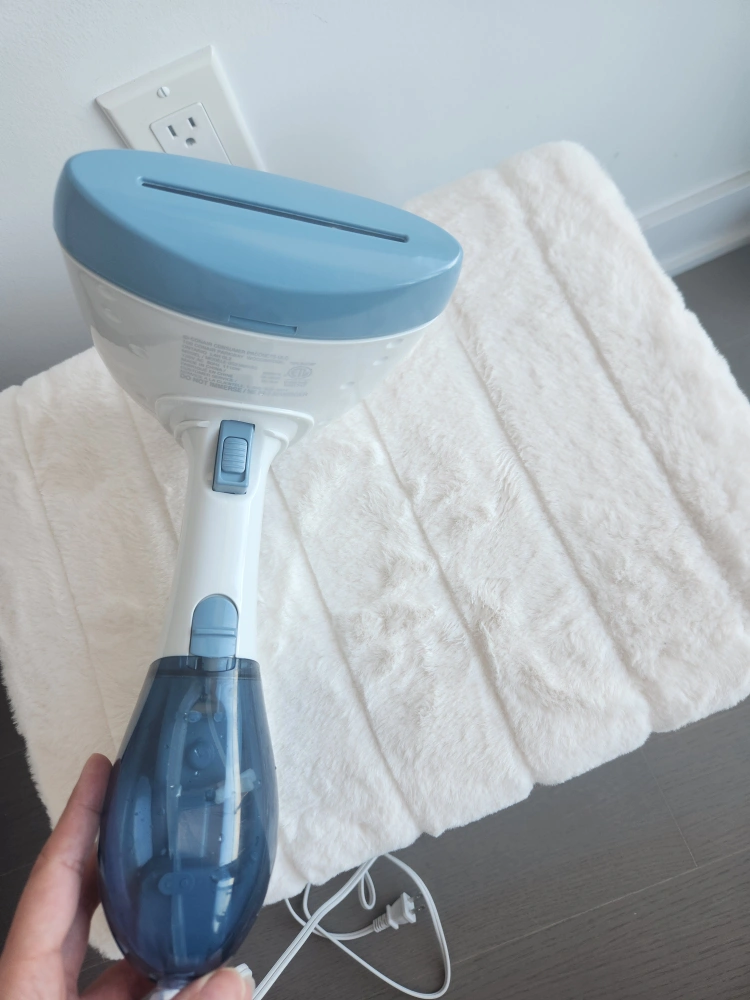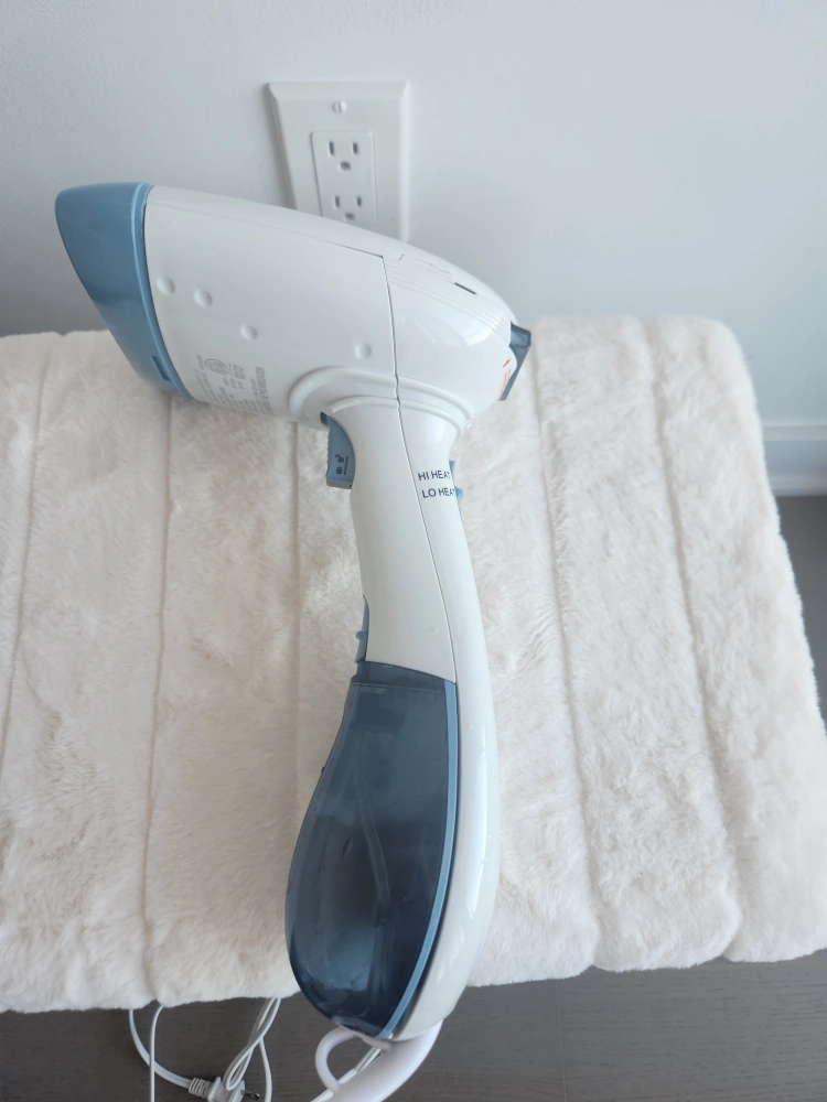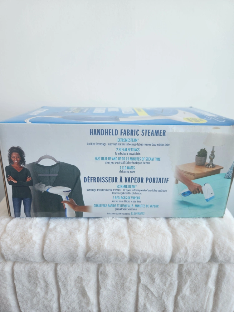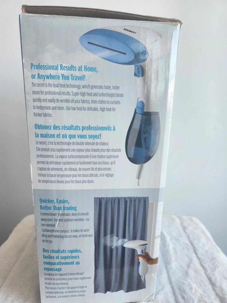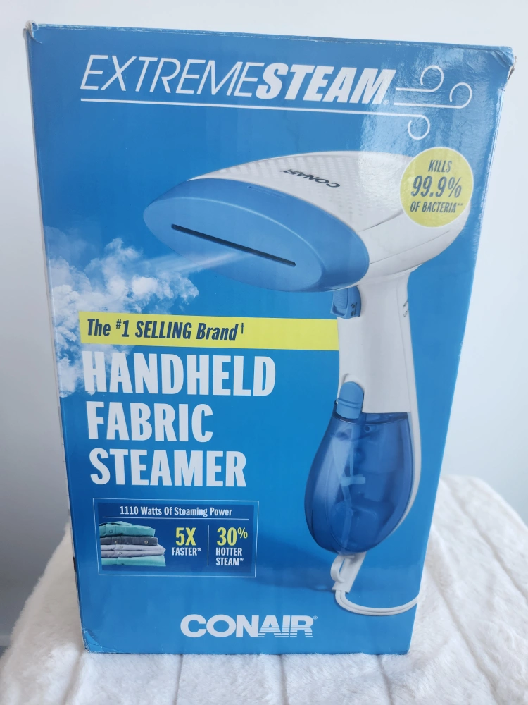 189Conair handheld fabric steamer. 1110 watts of steaming power. Dual heat technology. Heats up in under 15 minutes. Great for quick wrinkle removal. Lightweight and easy to use. has a little scratch at the back shown in picture but it's in great working condition.