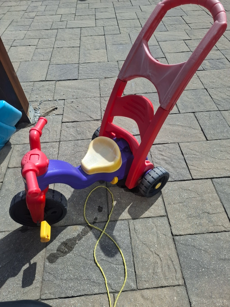 18Child's plastic tricycle. Features a push handle for parent assistance. Purple and red colour scheme. Shows some wear.
