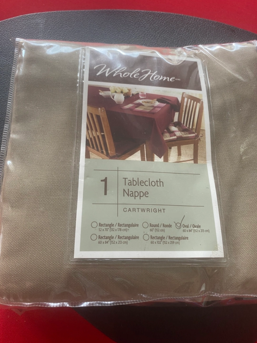 New, unused tablecloth. Beige colour. Oval shape. Measurements: 60 x 84 inches (152 x 213 cm). From Whole Home.