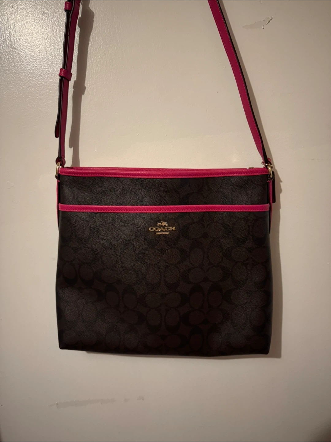 Selling a Coach crossbody bag in a stylish brown and pink colour combination. It's perfect for everyday use and keeping your essentials organized. The bag features the iconic Coach logo pattern. A great addition to any wardrobe!