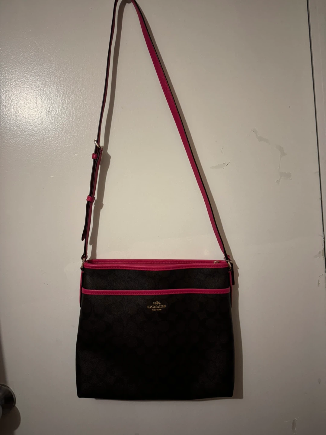Selling a Coach crossbody bag in a stylish brown and pink colour combination. It's perfect for everyday use and keeping your essentials organized. The bag features the iconic Coach logo pattern. A great addition to any wardrobe!