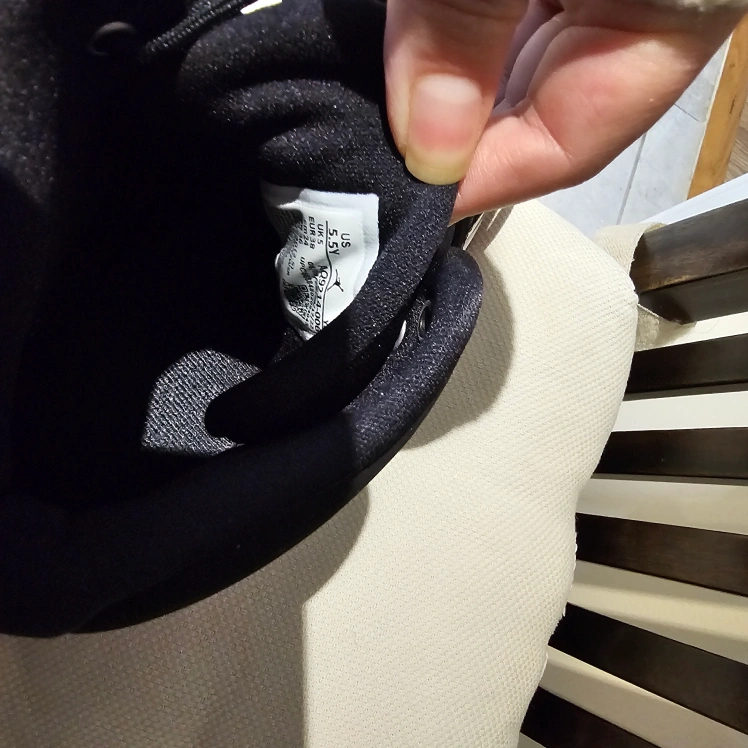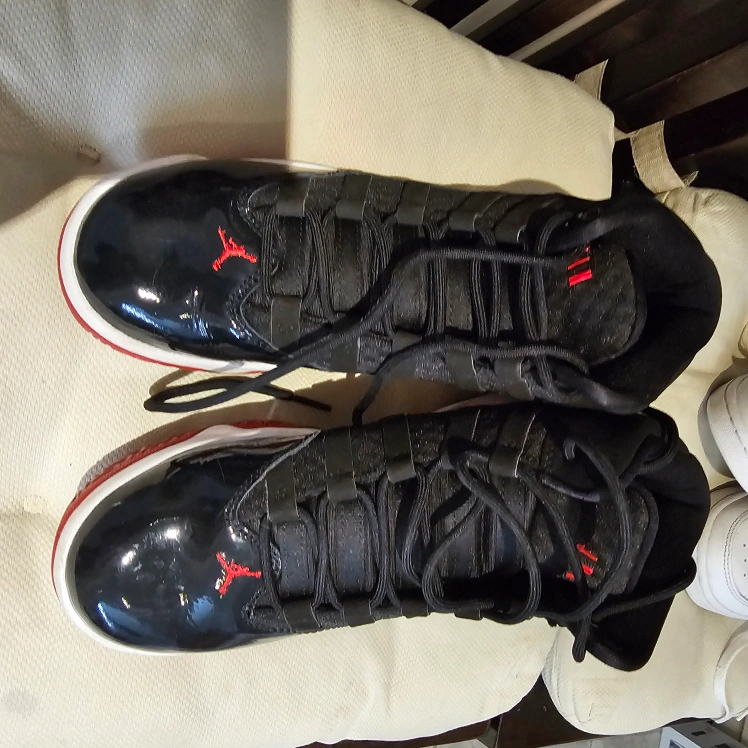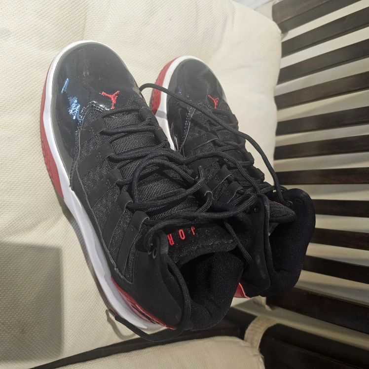 10Black and red high-top basketball shoes. Patent leather accents. Good condition. Size 5.5Y.