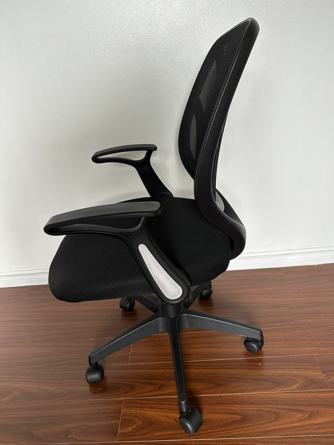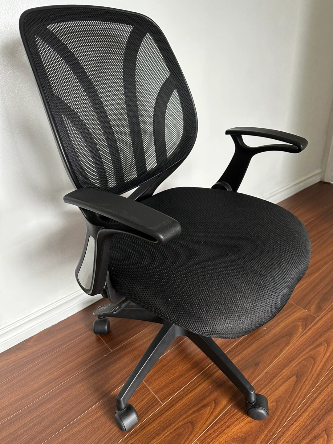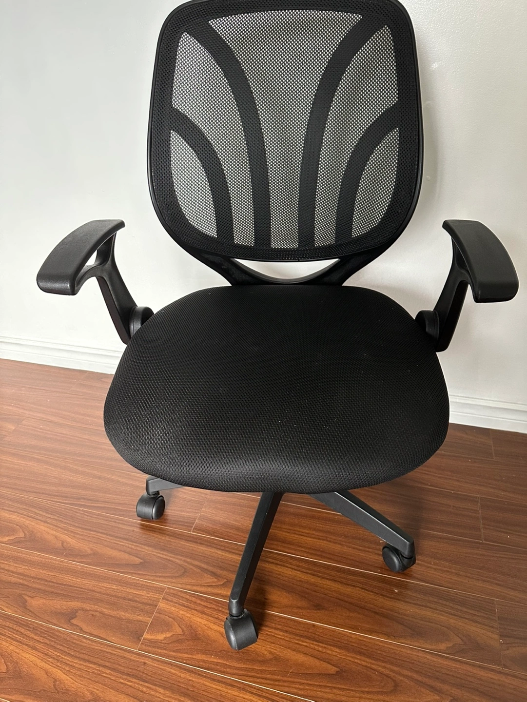 Comfortable office chair. Mesh back and padded seat. Five-star base with rolling casters. Adjustable armrests. Great for home or office use.