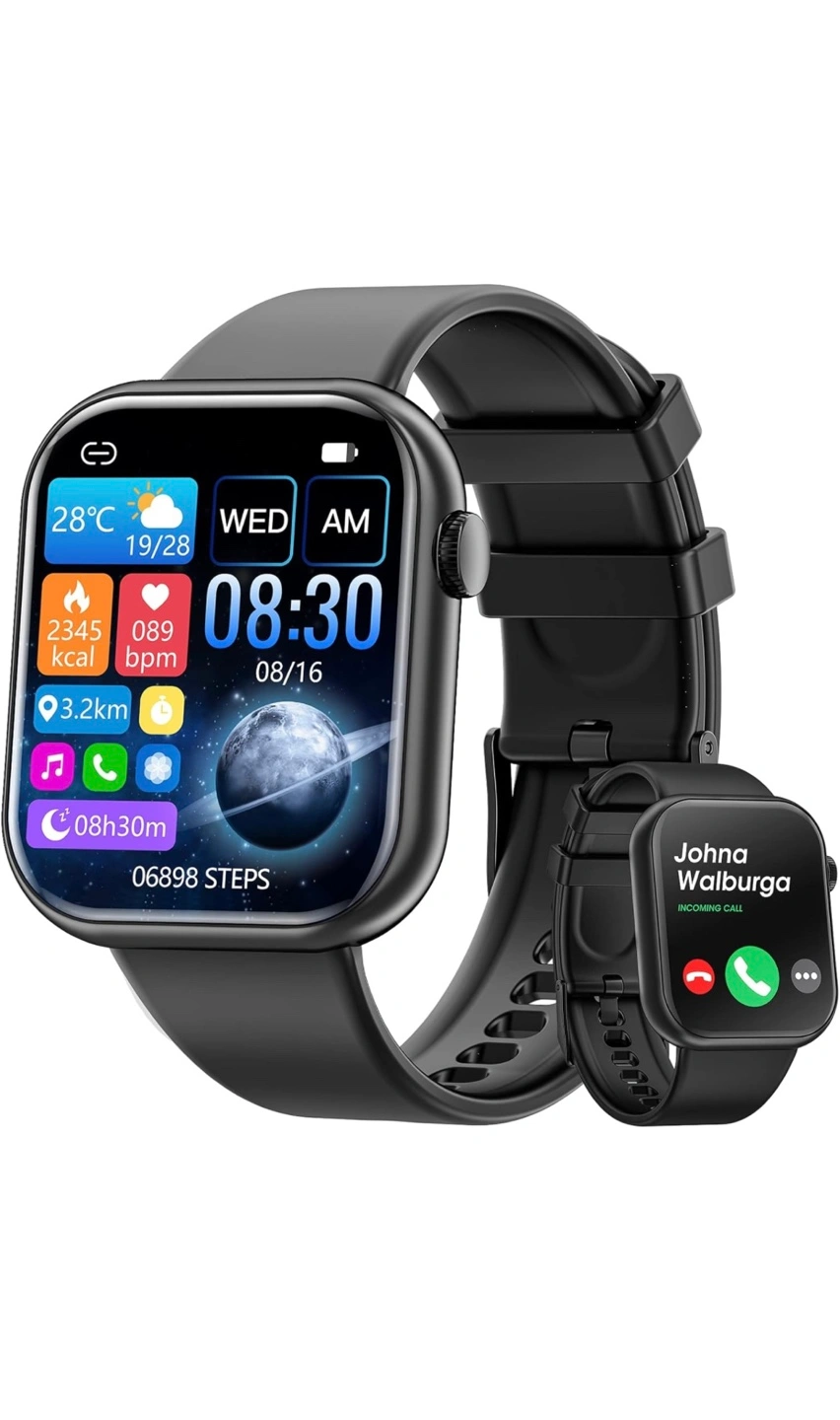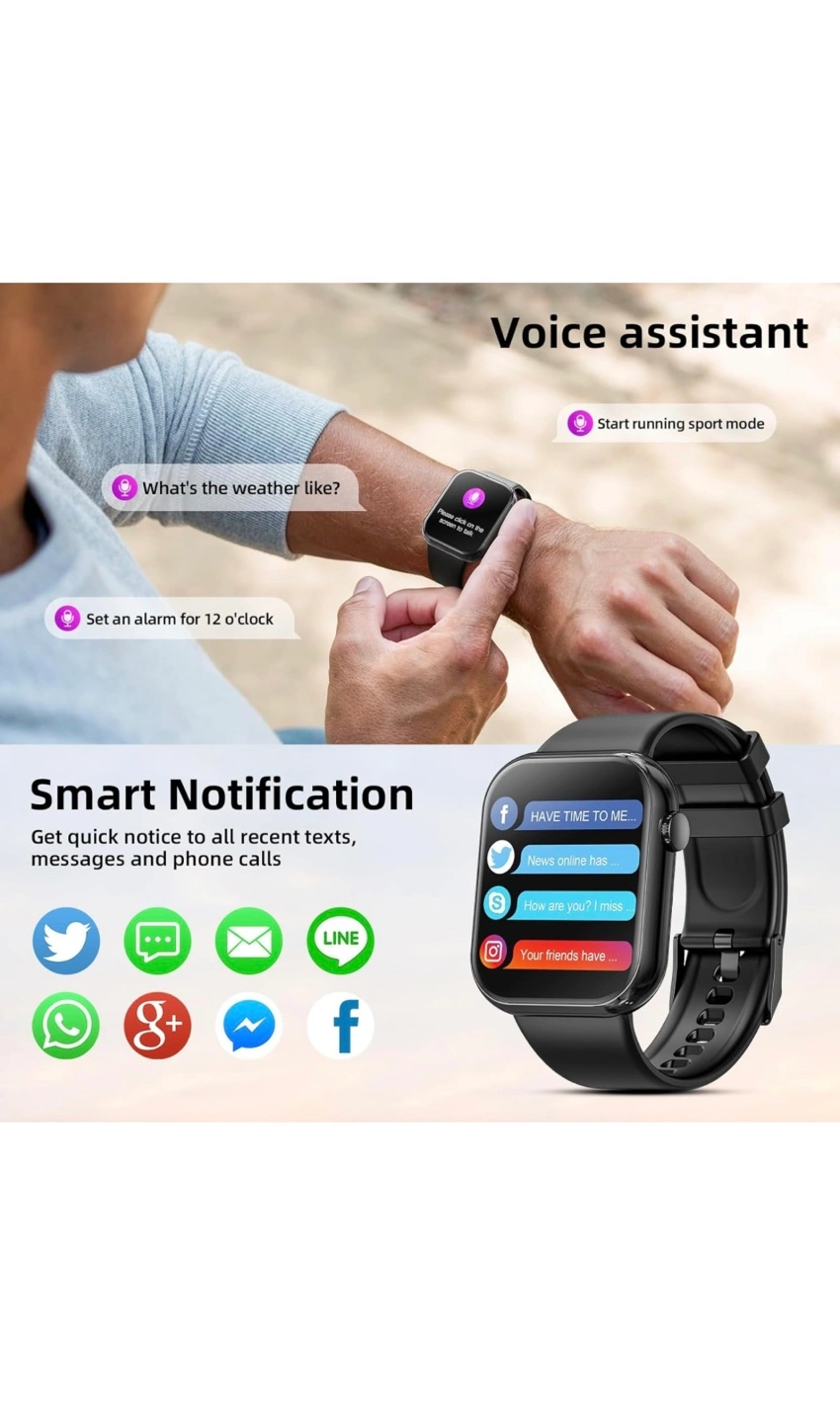 Smart Watch for Android and iOS(NEW) * 【Bluetooth Call & Smart Notifications】Smartwatches have built-in speakers. Just connect the smart watch to your phone via Bluetooth, and you can directly use the watch to answer/make calls/play music/store contacts/view call history, and also receive messages and social media notifications from your phone. You'll never miss a call or message during a meeting or workout. * 【1.85 inches Large Screen Smart Watch】Smart watches for men women, equipped with a 1.85-inch high-definition touch screen, 240*280 high-definition resolution, and more detailed and clear picture quality, giving you a broader visual enjoyment. There are 100+ watch faces for you to choose from in the cloud watch face. In addition, you can also customize the watch face. You can choose your favorite photos (such as family, and selfies) as your watch background to show your personality. * 【All-day Health Activity Tracker】Fitness watches can record your activities throughout the day, such as steps, calories burned, and distance walked. It can track and analyze sleep time and heart rate, as well as monitor blood oxygen. All data can be synced to your phone for analysis, helping you gain a deeper understanding of your health. The device also provides sedentary reminders and water-drinking reminders to help you better manage your health and maintain a good lifestyle. * 【Multiple Sports Modes & IP67 Waterproof】This smart watch has more than 100 sports modes such as walking, running, cycling, elliptical machine, yoga, Pilates, basketball, etc. It can track your daily activities and provide you with real-time statistics and good fitness results. Complying with the IP67 waterproof level, it can meet daily waterproof needs, such as hand washing, sweat protection, rain protection, etc. (Soaking, diving/sauna, etc. are not recommended to avoid watch corrosion) * 【Compatibility & Long Battery Life】Smart watch for Android iOS phones is compatible with Android 5.1 and above, and iOS 8.2 and above smartphones. Equipped with a large 250 mAh battery, it can provide up to 3-7 days of use and an incredible 30 days of standby time. It only takes 2 hours to charge, so you don't have to worry about the watch running out of power.