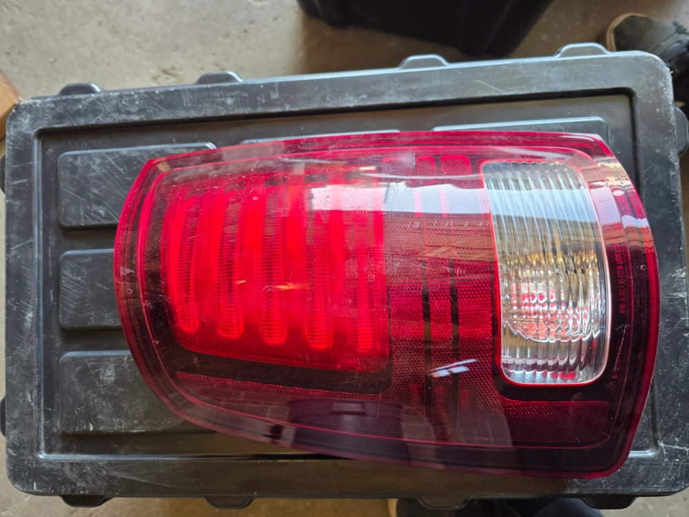 Used Dodge Ram truck tail light assembly. Red lens, includes wiring harness. Some minor scuffs and scratches. Drive side