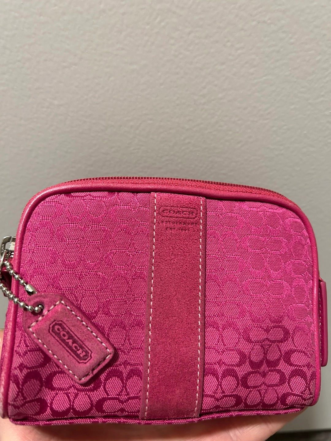 Features a zipper closure and Coach logo. Compact and perfect for everyday use.