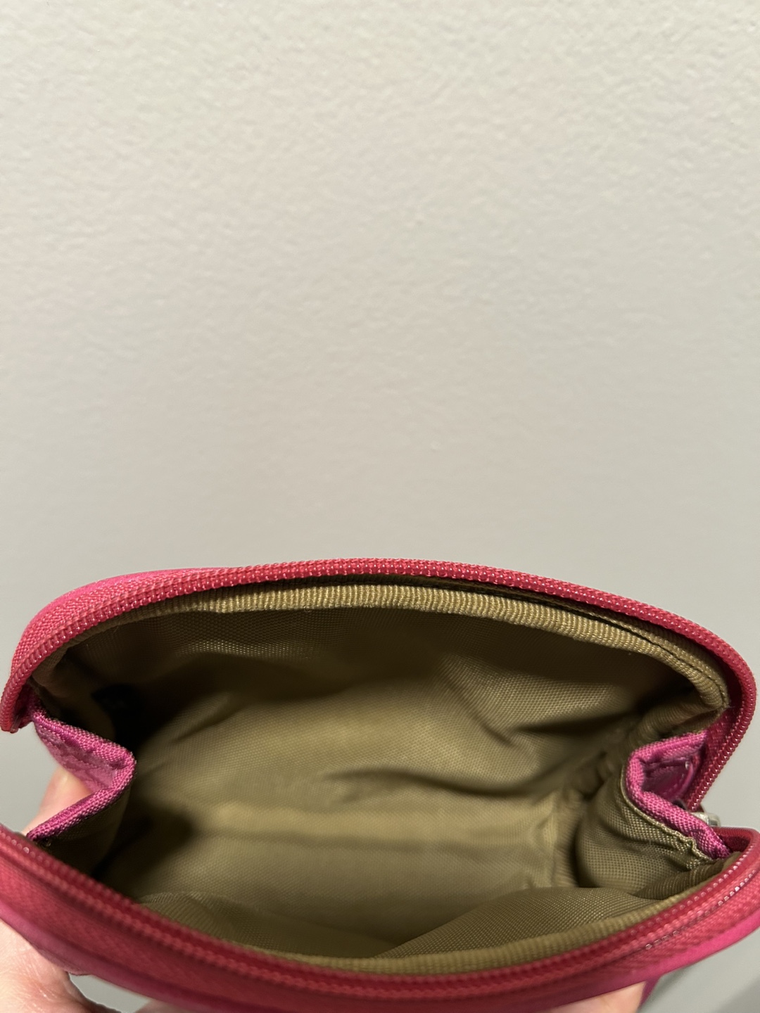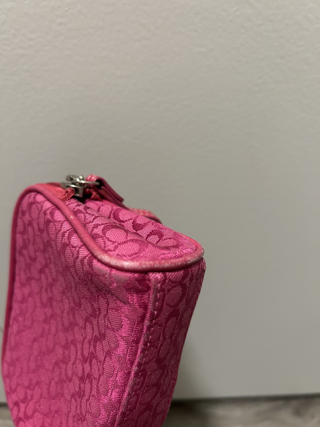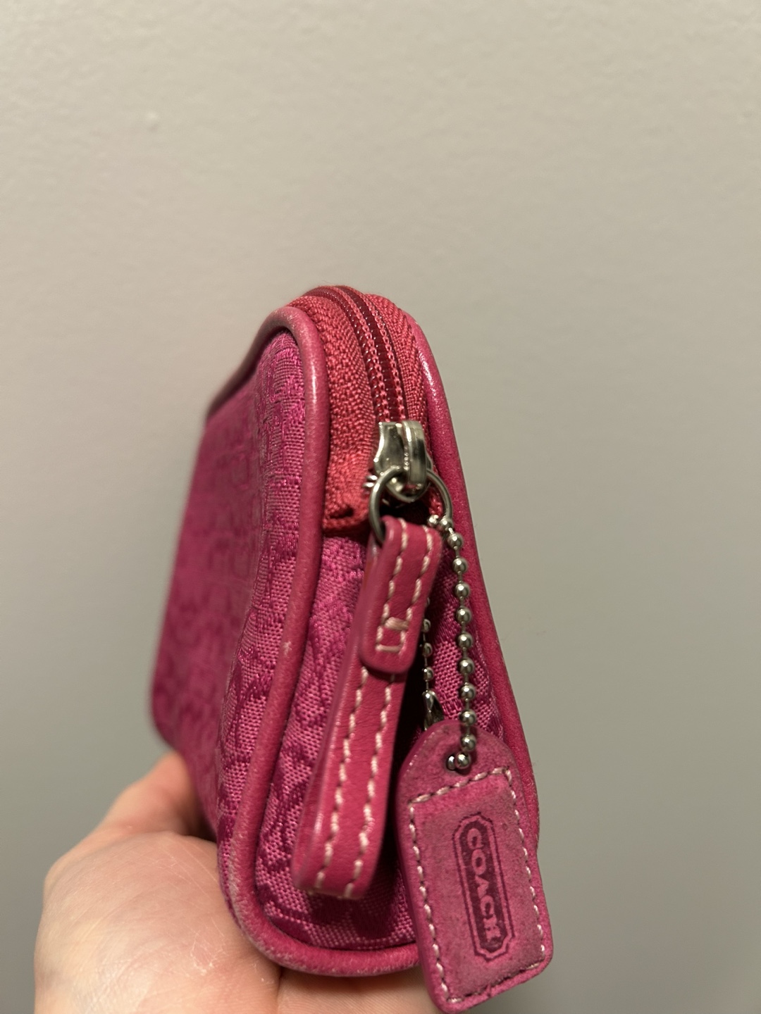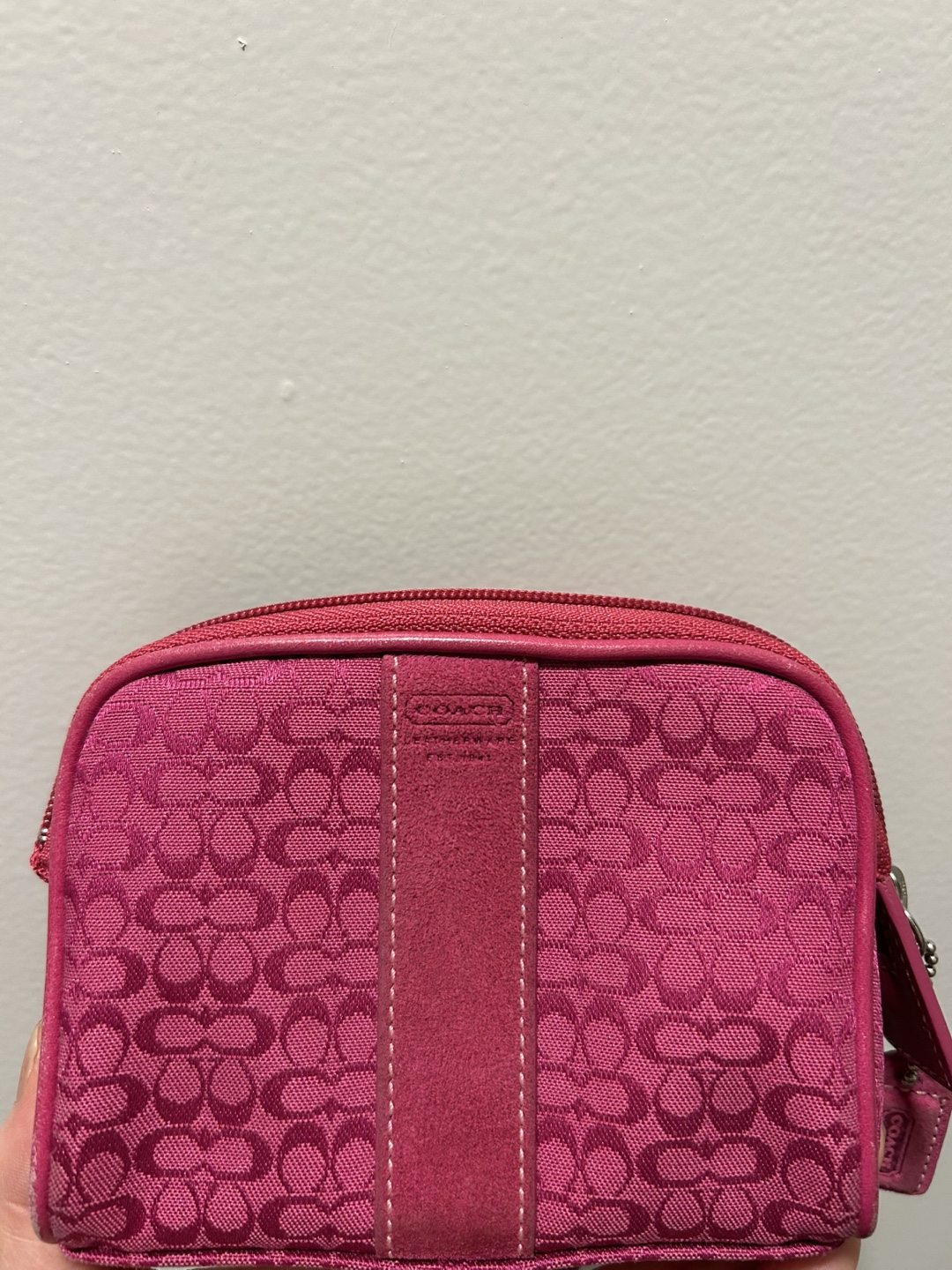 Features a zipper closure and Coach logo. Compact and perfect for everyday use.