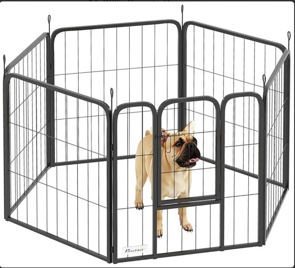 Flexible design, customizable shape. Robust and secure, made from tough steel. Lockable door, keeps pet secure. Includes ground stakes. Folds down neatly for easy transport. Lightweight, portable. Quick set up. Suitable for small dogs. Measures 22" W x 23.6" H x 0.6" D.