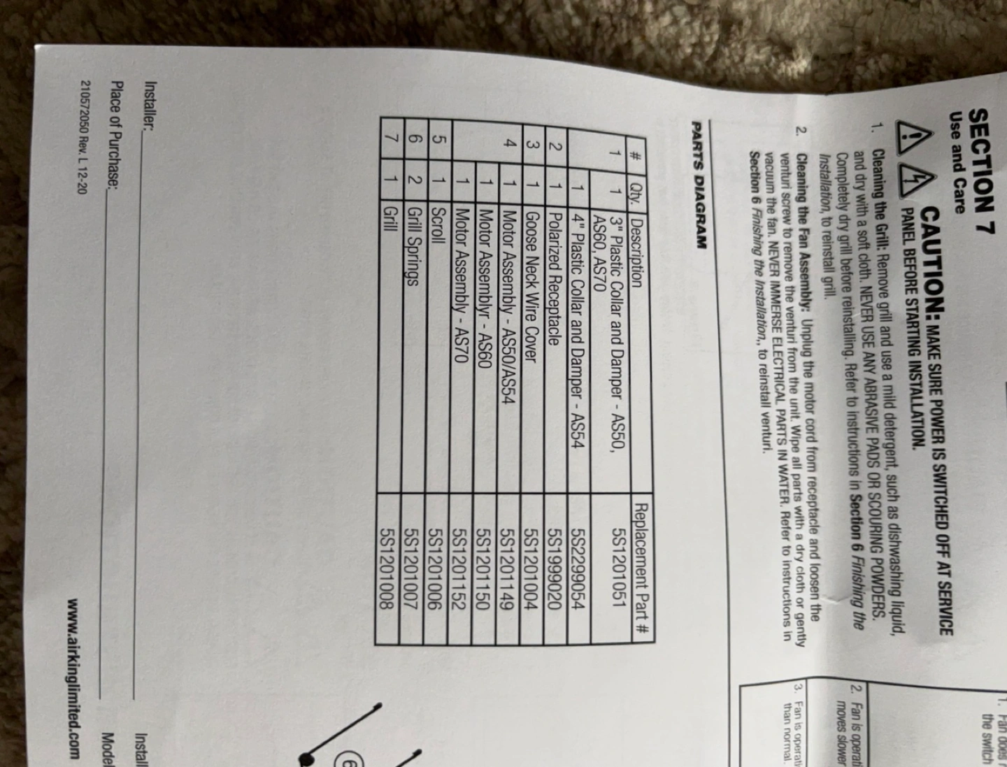 Air King AS50KIT Replacement Parts Kit for AS50 Ventilation Fan