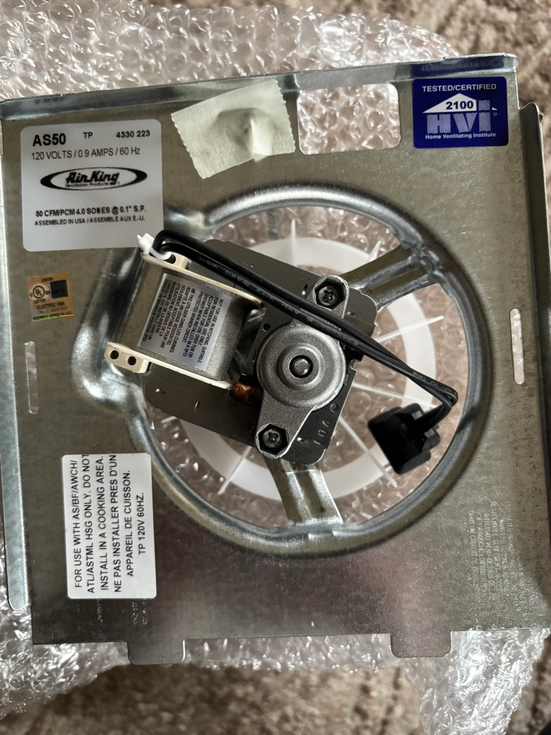 New, unused Air King AS50KIT replacement parts kit. Includes motor and fan blade. For use with AS50 model ventilation fan.