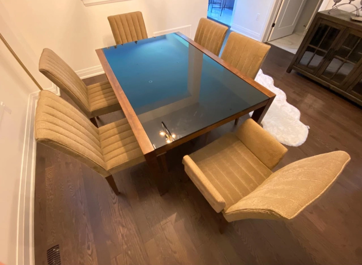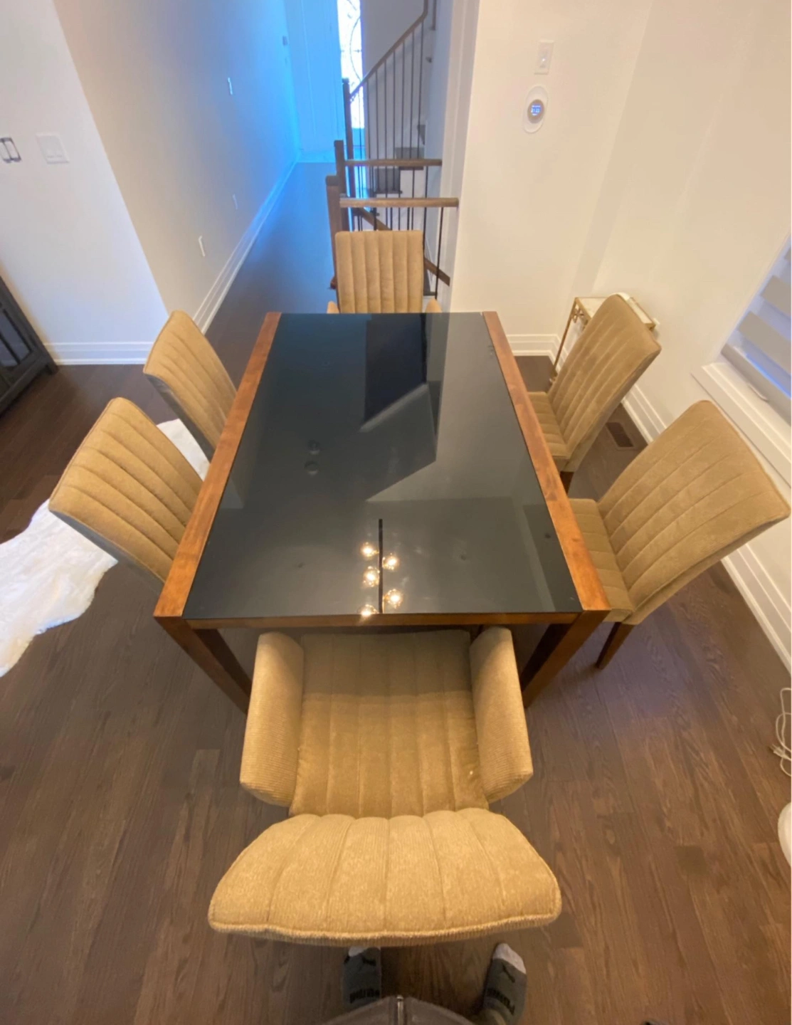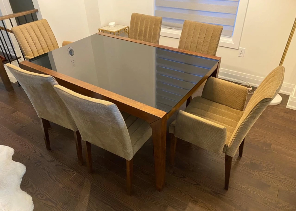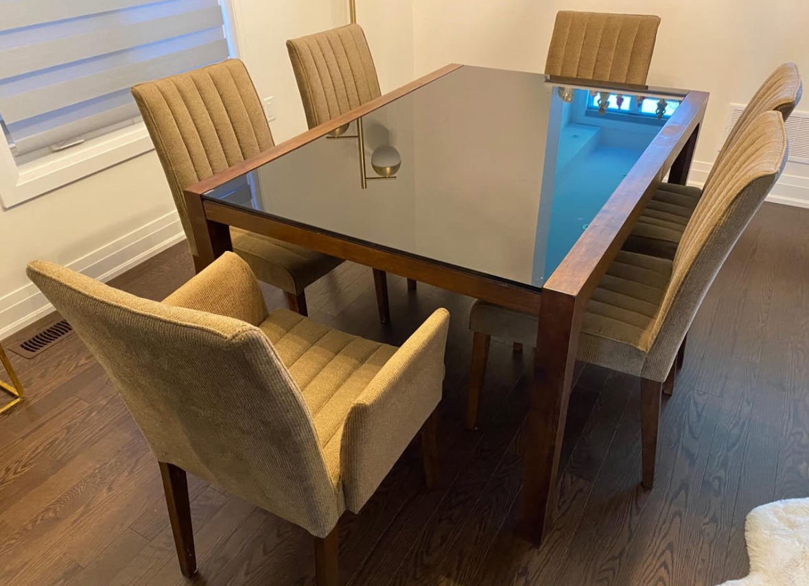 Dining Table with black tempered glass and solid wood legs. 6 comfy chairs 2 have arms. Table size is 59x40.5. Now reduced