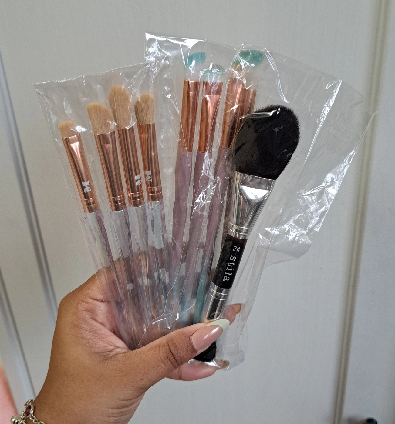 Assortment of new makeup brushes. Includes one double-ended brush and three sets of eyeshadow brushes. All brand new brushes.
