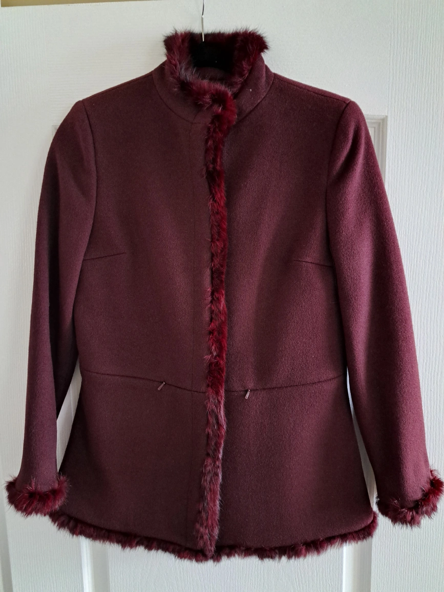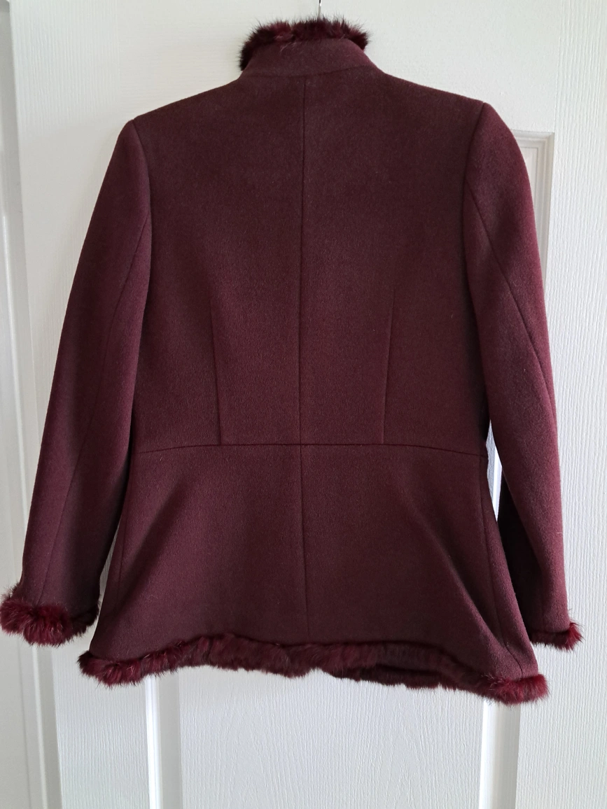 Beautiful vintage burgundy wool jacket. Features a fur trim around the collar and hem. Size 38. Dry clean only.