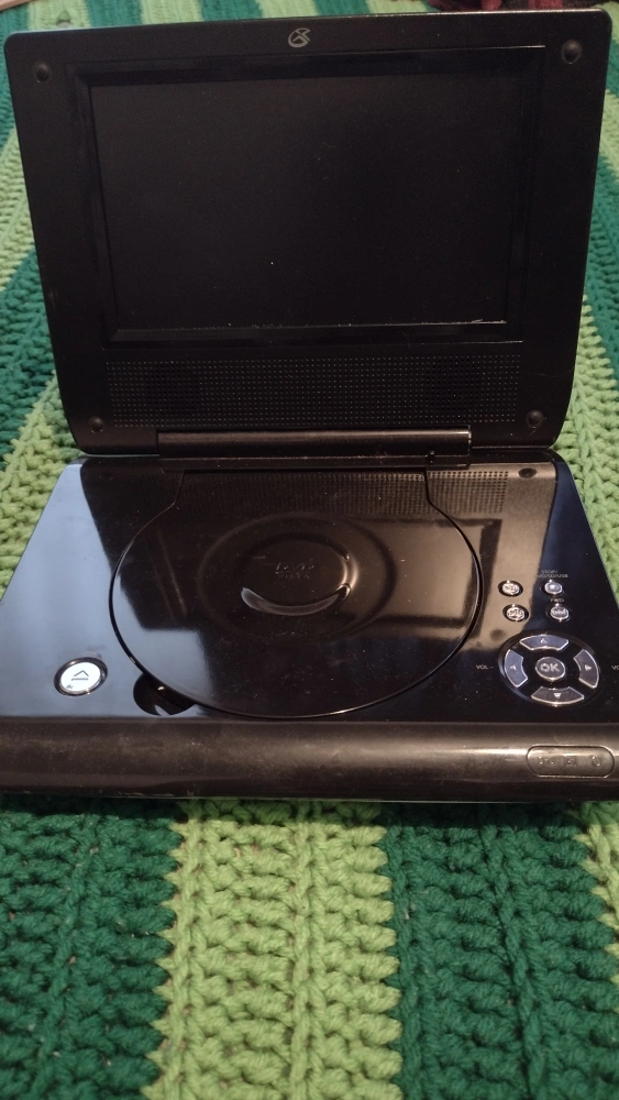 Portable DVD player with a built-in screen. Plays DVDs and uses USB and SD card. Features volume controls and basic playback buttons. Black casing with a small screen. needs power cords does work