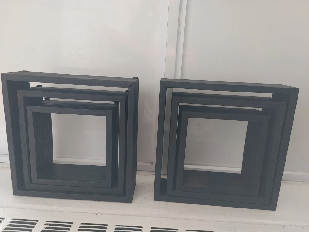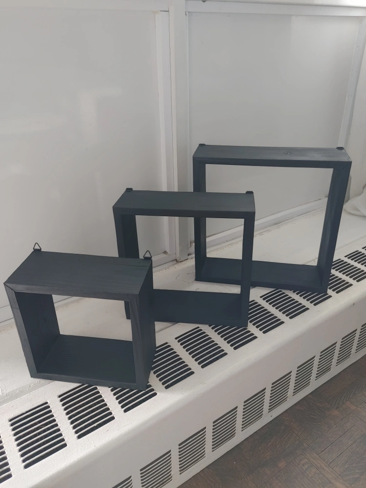Perfect for minimalist decor. Wall mountable. Great for displaying small items or adding visual interest to a room. Solid wood construction, recently painted black.