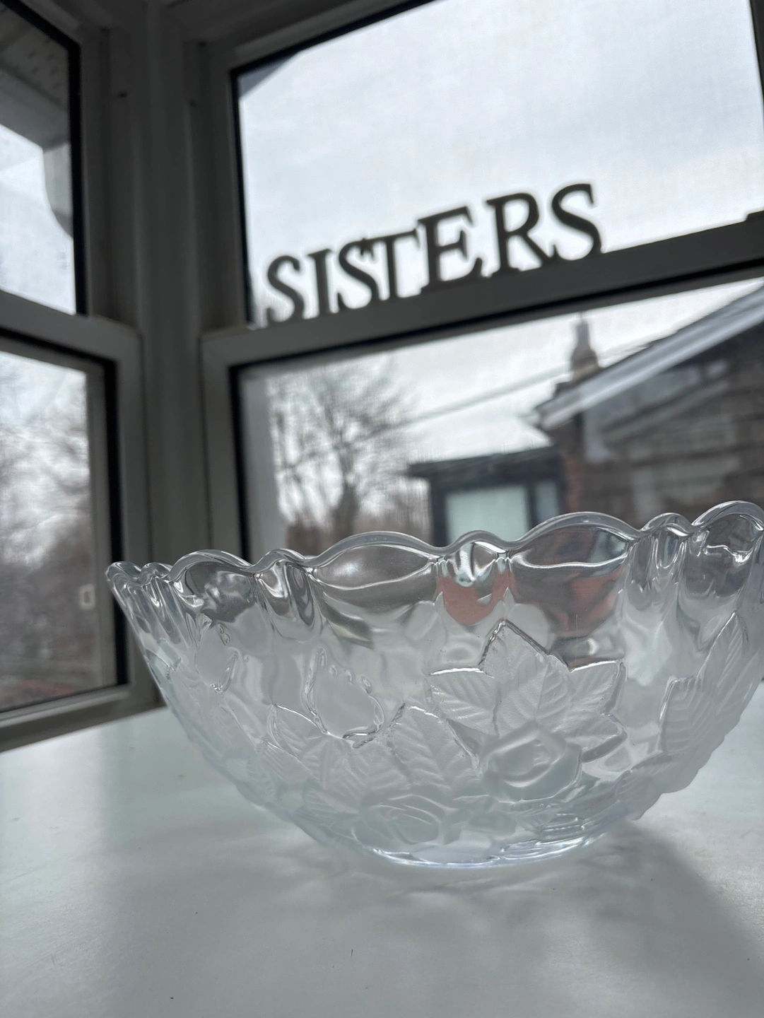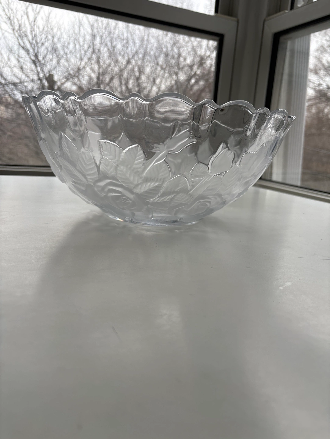 Beautiful, large crystal Mikasa bawl. Features an etched rose design. Scalloped edges. Perfect for serving or as a decorative centerpiece.