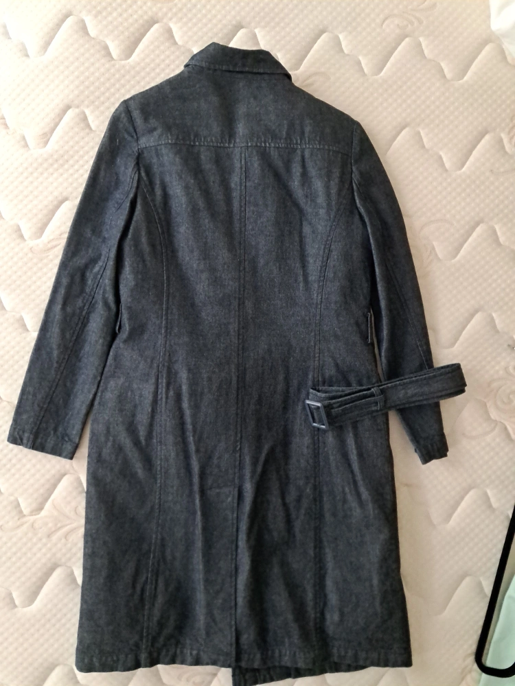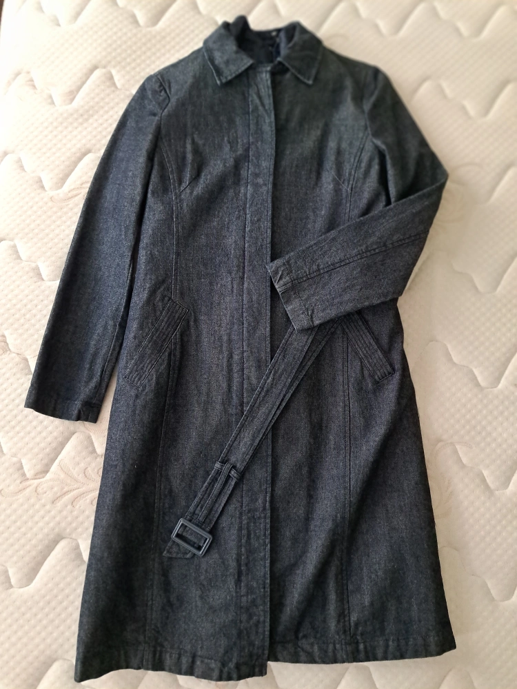 Dark grey denim coat. Long sleeves, belted waist. Quilted lining. Size 13. Fabric from Japan.