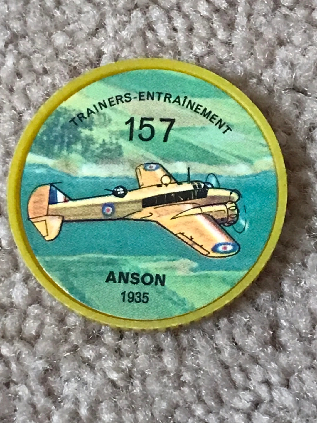 A vintage Jell-O and Hostess promotional token-coin. Yellow plastic. It features an Anson airplane.