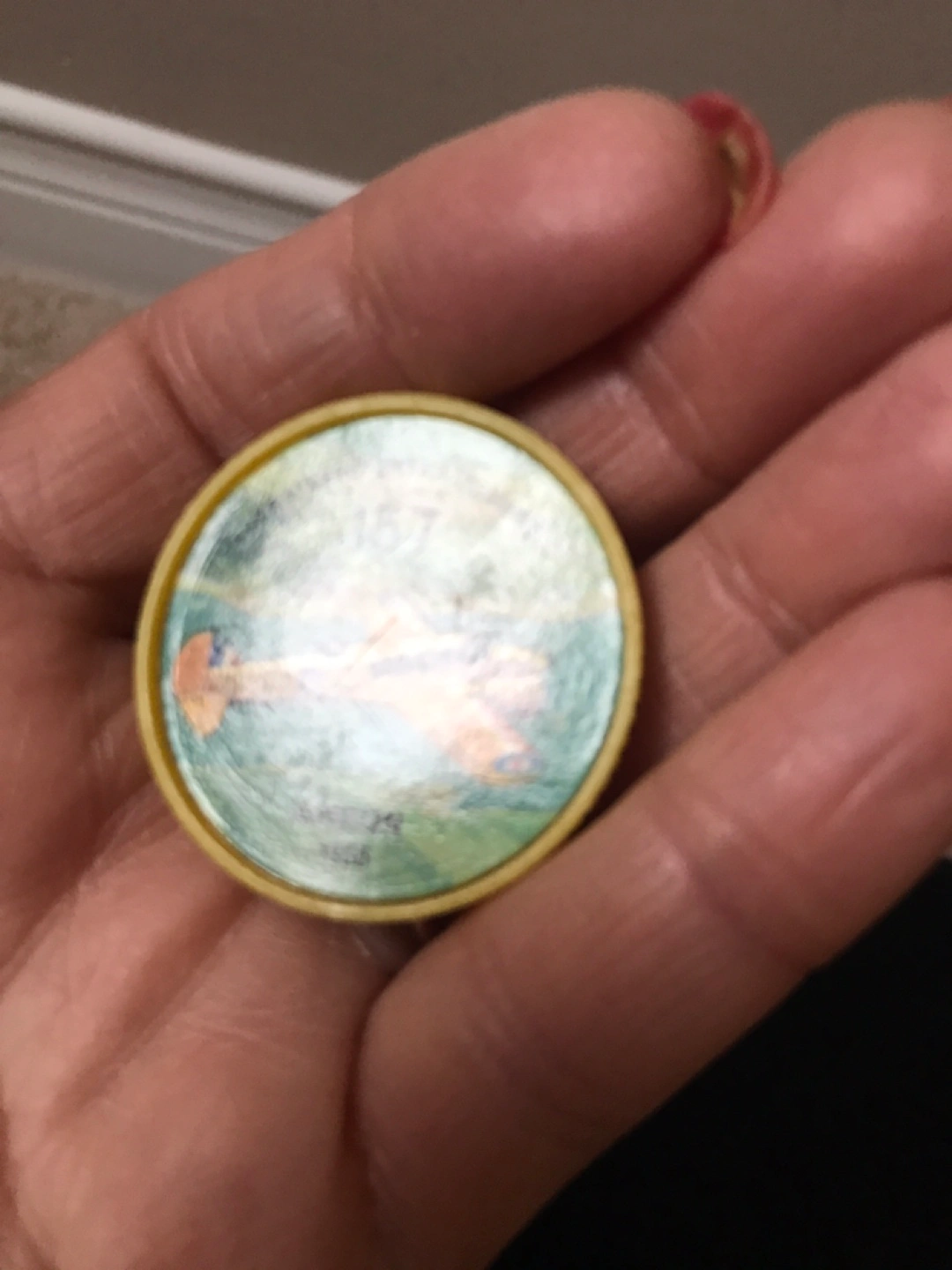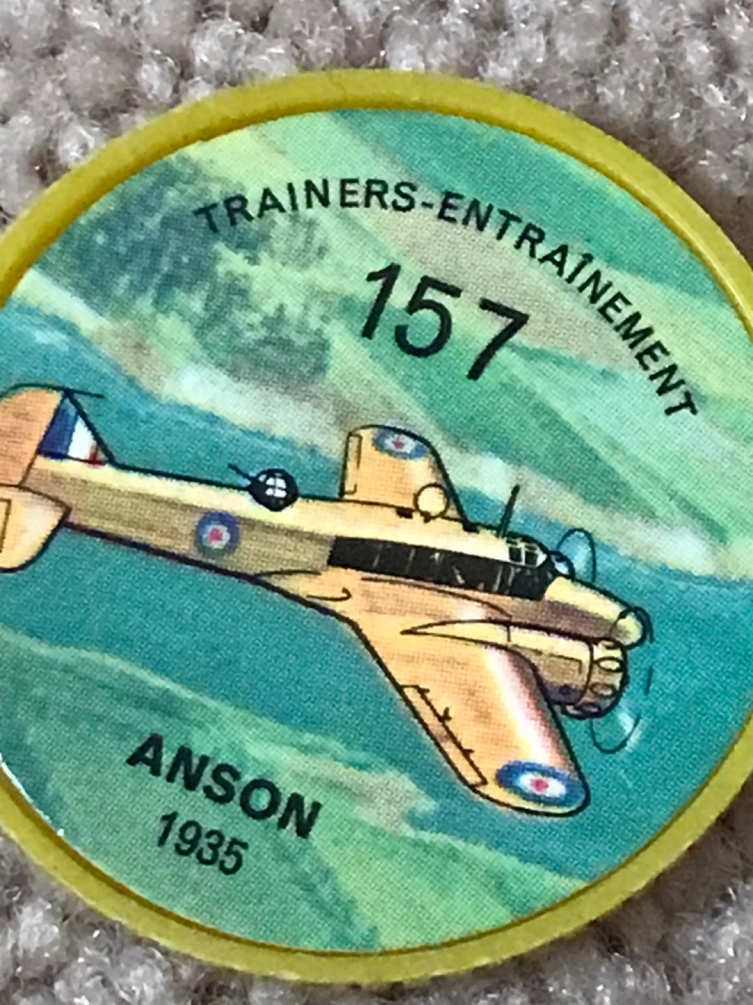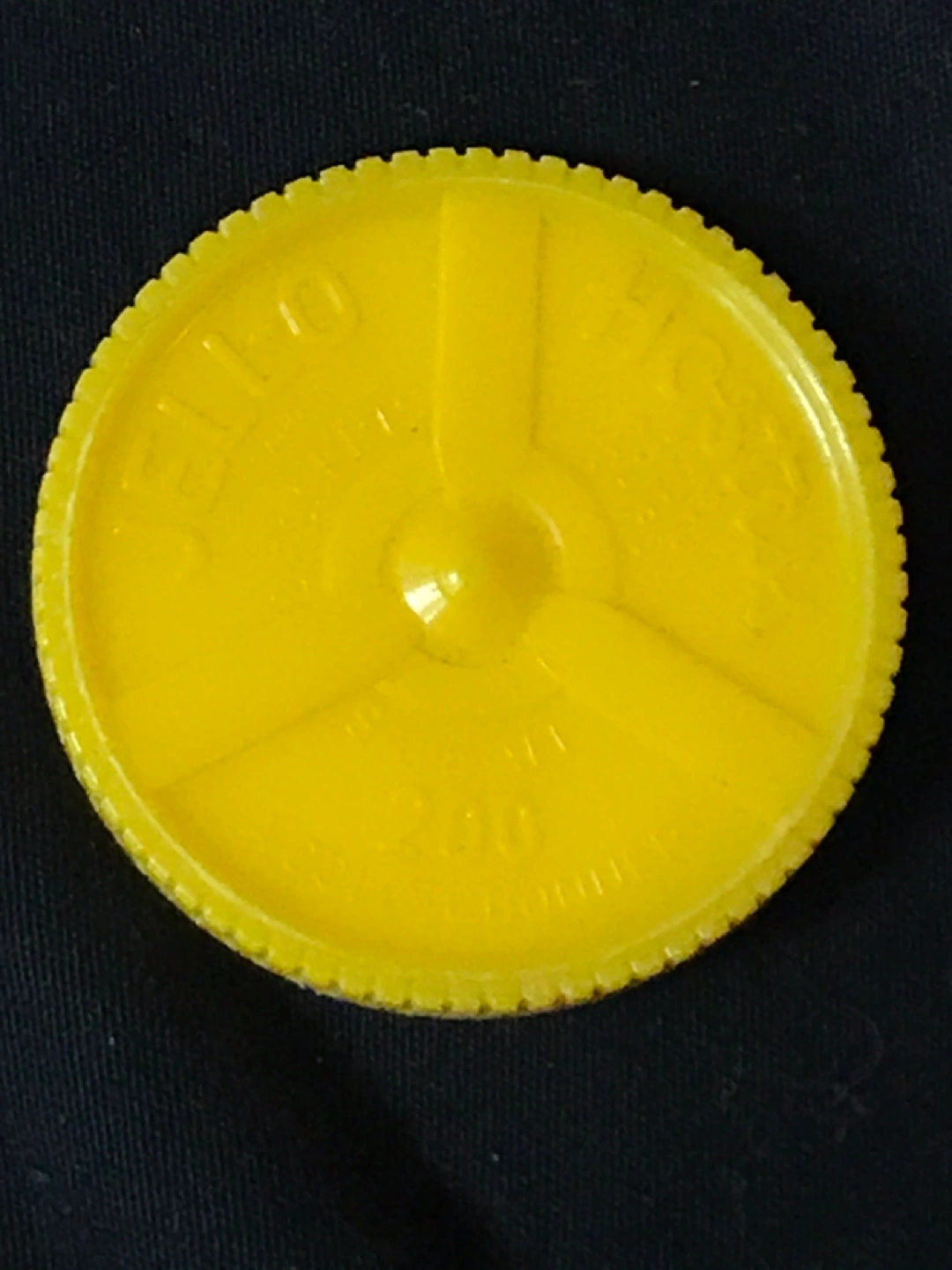A vintage Jell-O and Hostess promotional token-coin. Yellow plastic. It features an Anson airplane.