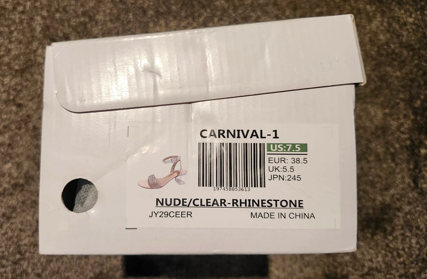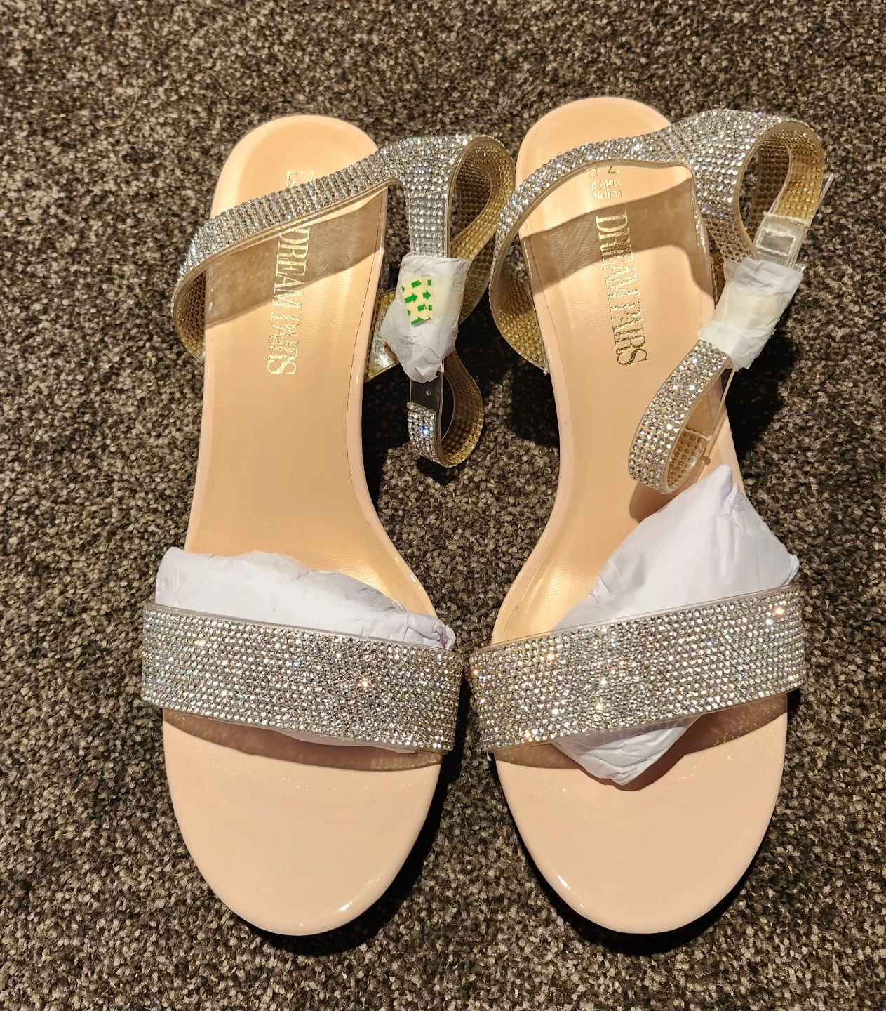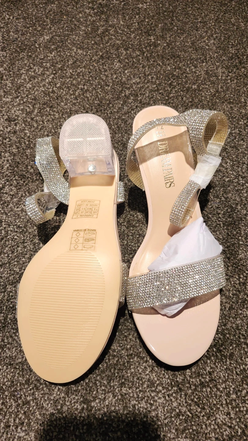 Sparkly rhinestone-embellished sandals with a clear block heel. These heels come in a nude and clear rhinestone design. US size 7.5, EUR 38.5, UK 5.5.