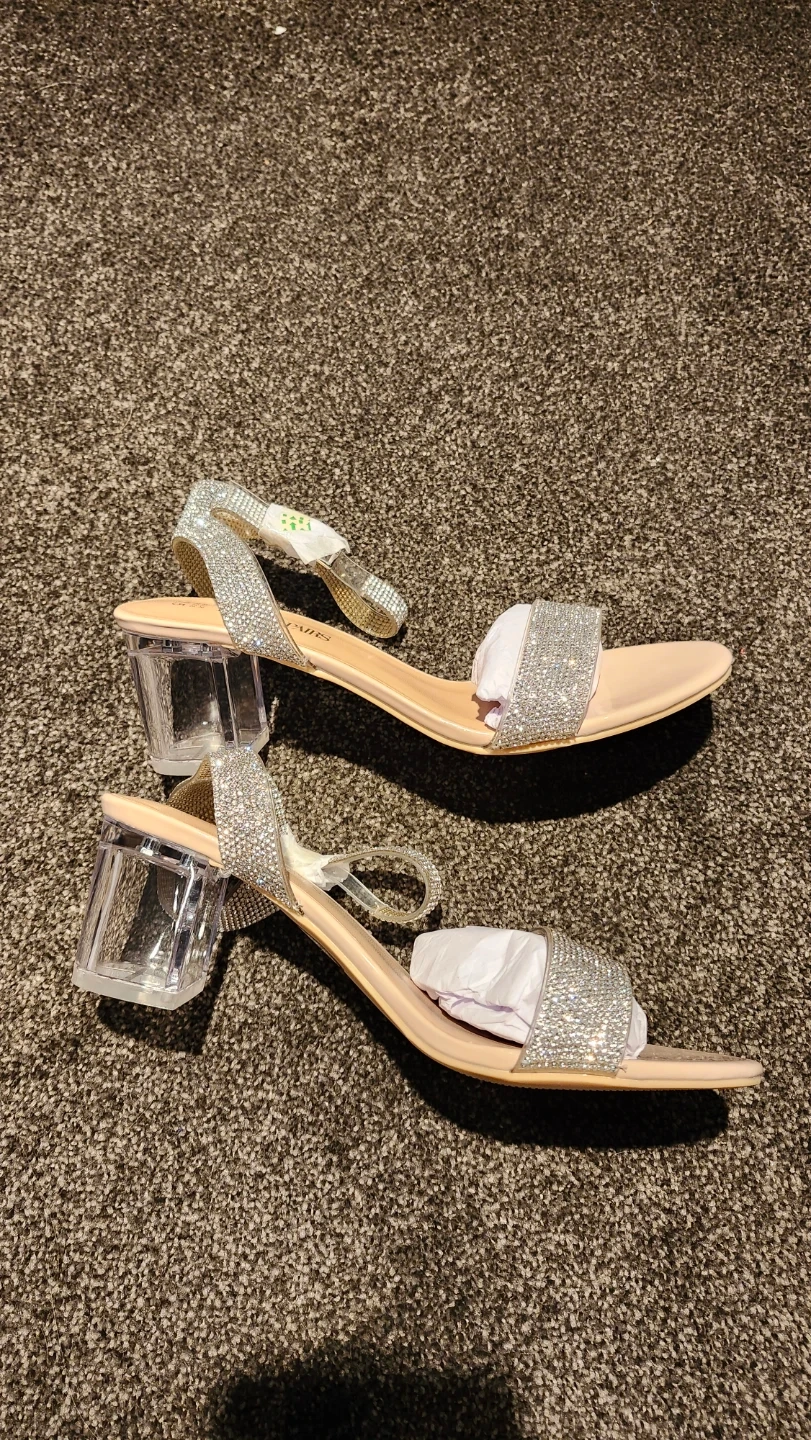 Sparkly rhinestone-embellished sandals with a clear block heel. These heels come in a nude and clear rhinestone design. US size 7.5, EUR 38.5, UK 5.5.