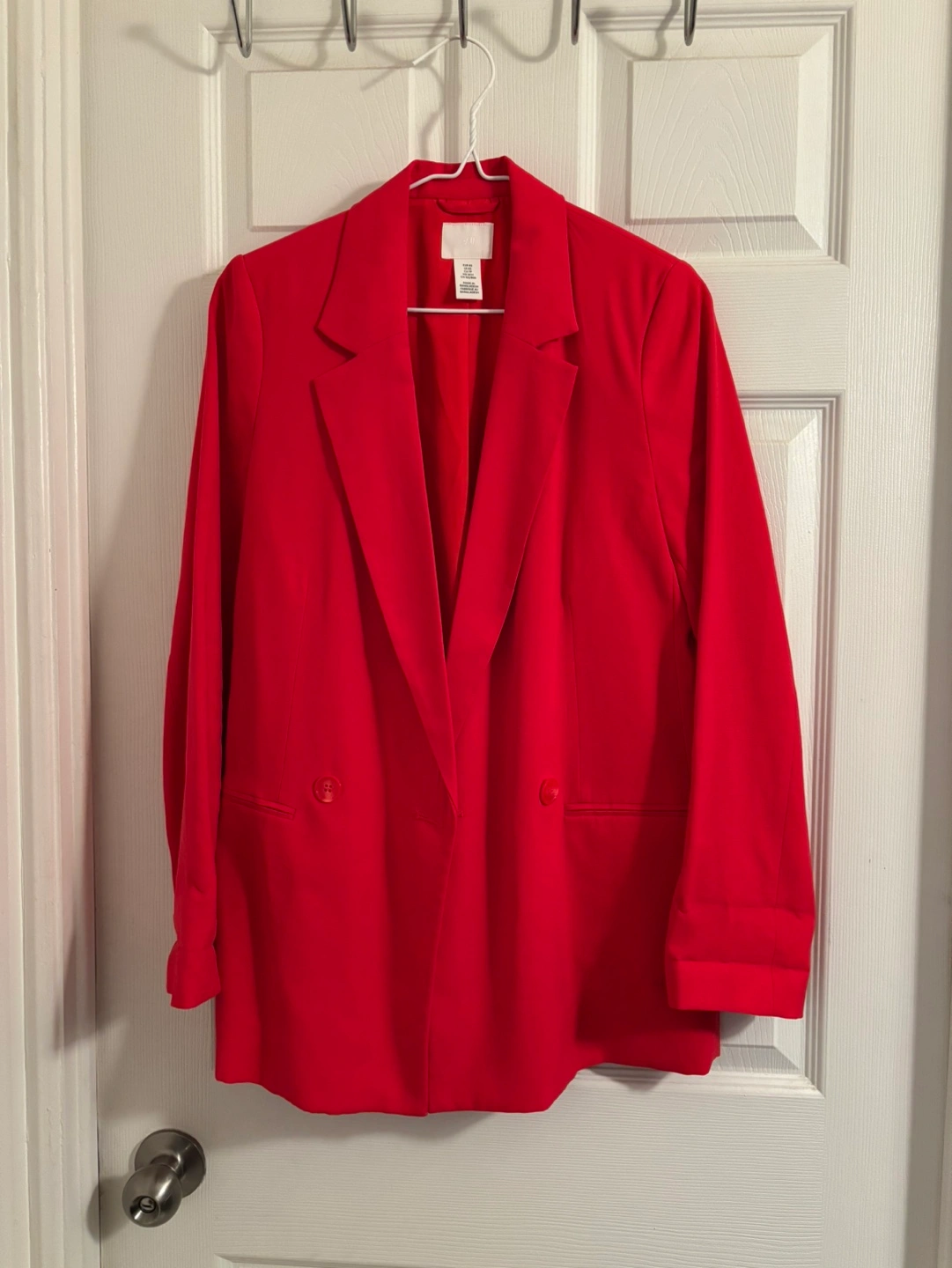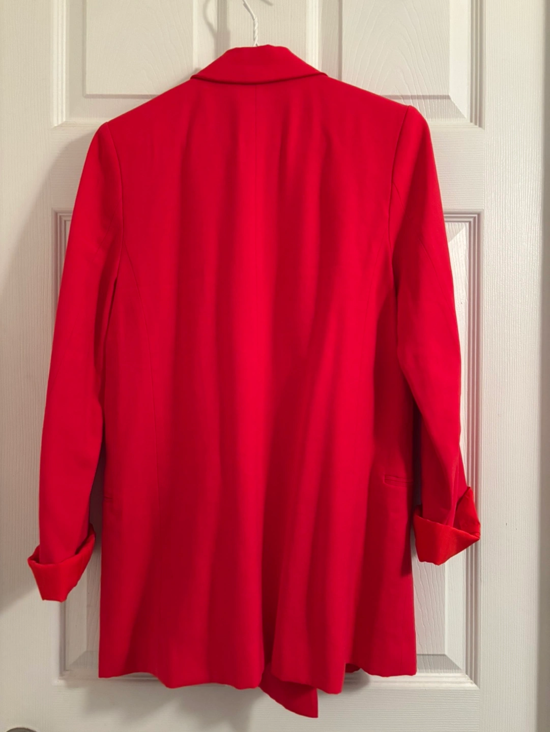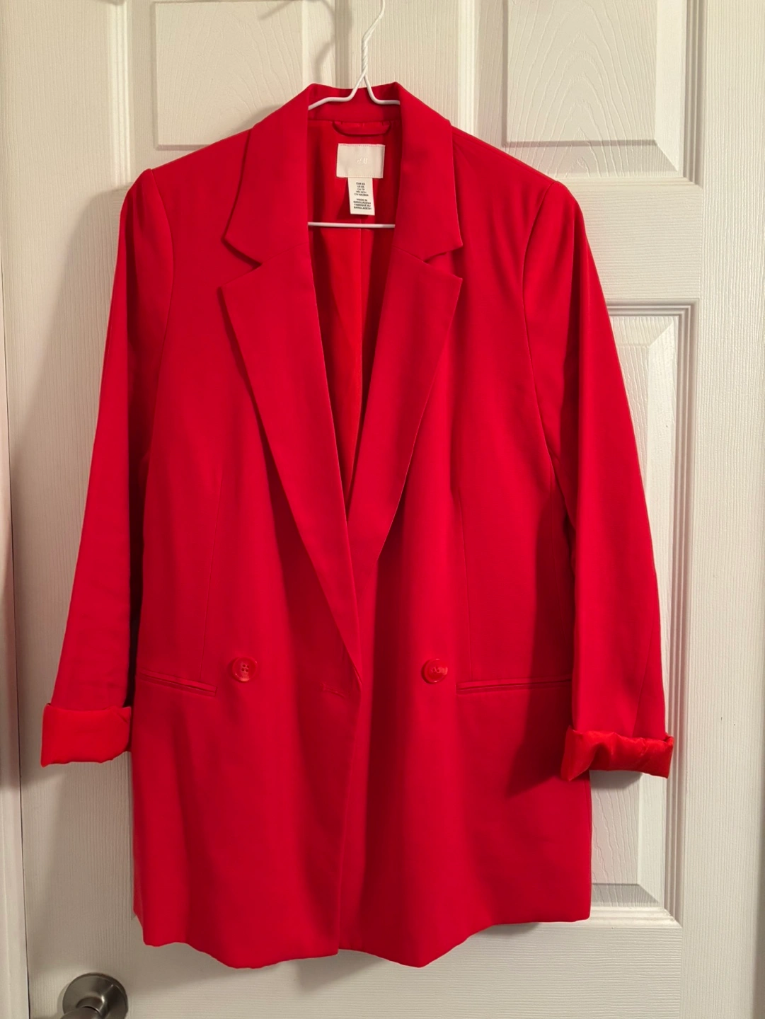 Women's red blazer. Double-breasted. Relaxed fit. Long sleeves with turn-up cuffs. It runs big. Used just once.