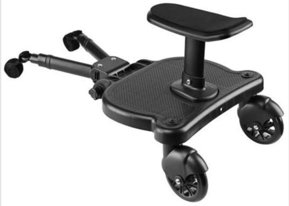 Black stroller board. Attaches to most strollers. Great for toddlers. Includes backrest. Wheels for easy manoeuvrability. Durable plastic construction.