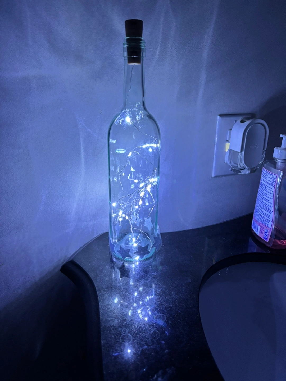 Bulk lot of 32 wine bottles with embedded fairy lights. Perfect for weddings, parties, or home decor. Cork tops. Clear glass bottles. Selling as full set or individual. $100 for full set