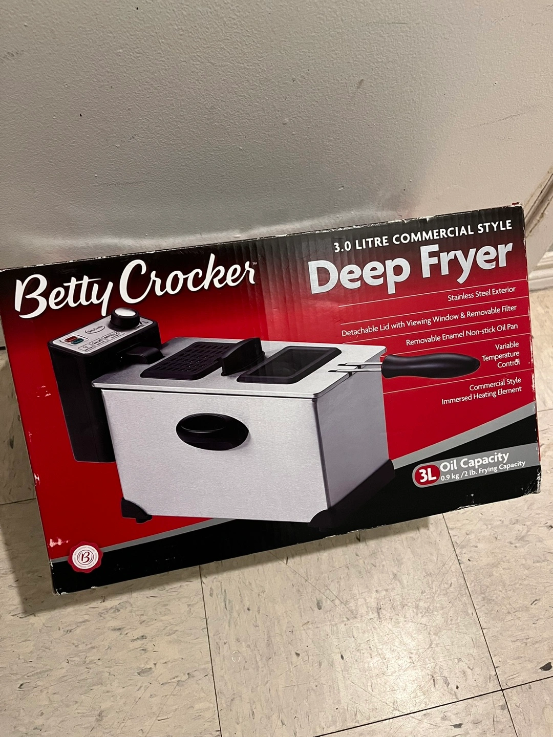 Brand new, never used, 3 litre deep fryer. Stainless steel with detachable lid with viewing window and removable non stick oil pan. Variable temperature control and Commercial style immersed heating element.