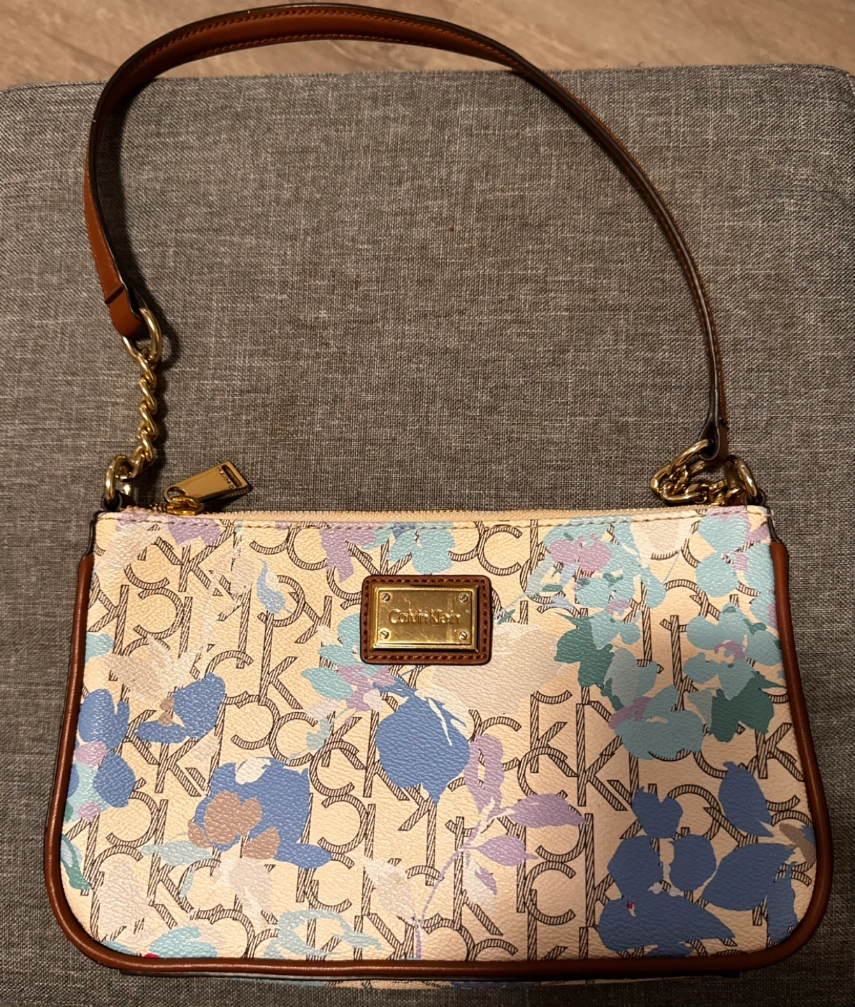 Small shoulder bag. Floral pattern on a cream background. Brown leather accents. Gold-toned hardware. Zip closure. Interior zip pocket. Chain and leather strap.