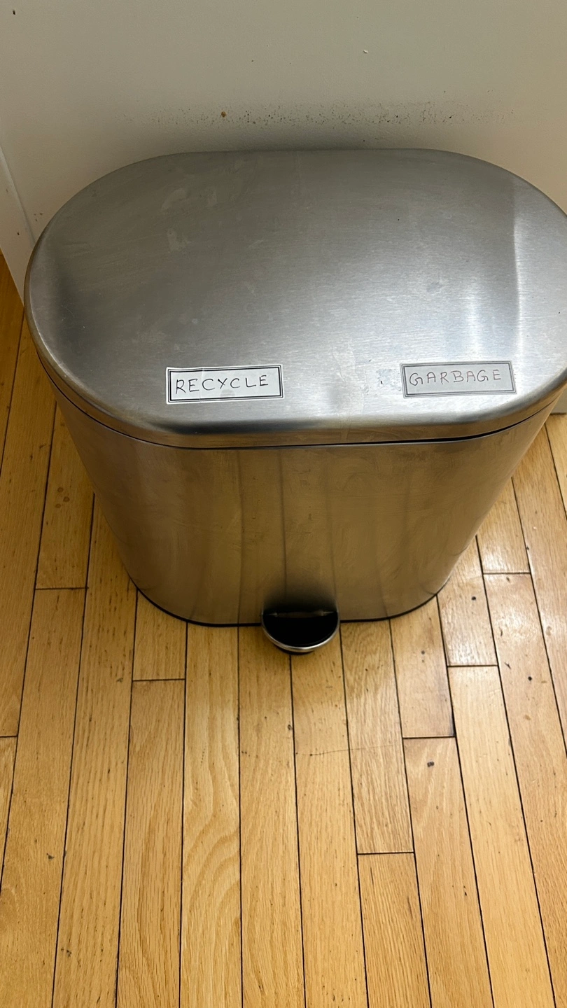 Oval-shaped stainless steel trash can. Two compartments for garbage and recycling. Foot pedal for easy opening. Removable inner bins.