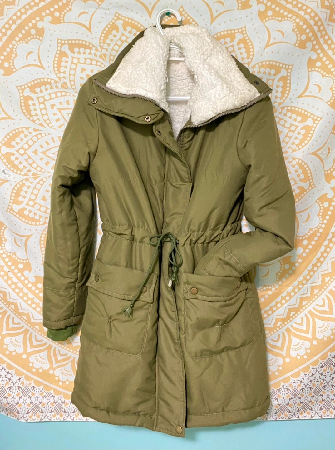 I am selling my slightly used , cleaned , covid free home in ladies small green jacket with thick lining and a tall neck ! With drawstrings!!!