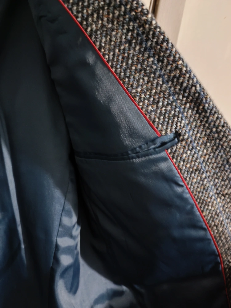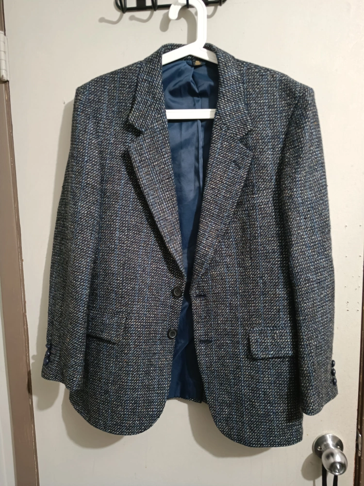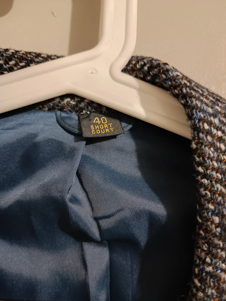 Moores brand Harris Tweed wool sport coat, likely a men's size 40, made in Canada. It features a blue-gray tweed fabric with multicolor threads. The jacket has a two-button closure, notched lapels, flap pockets, and buttoned cuffs. The lining is blue