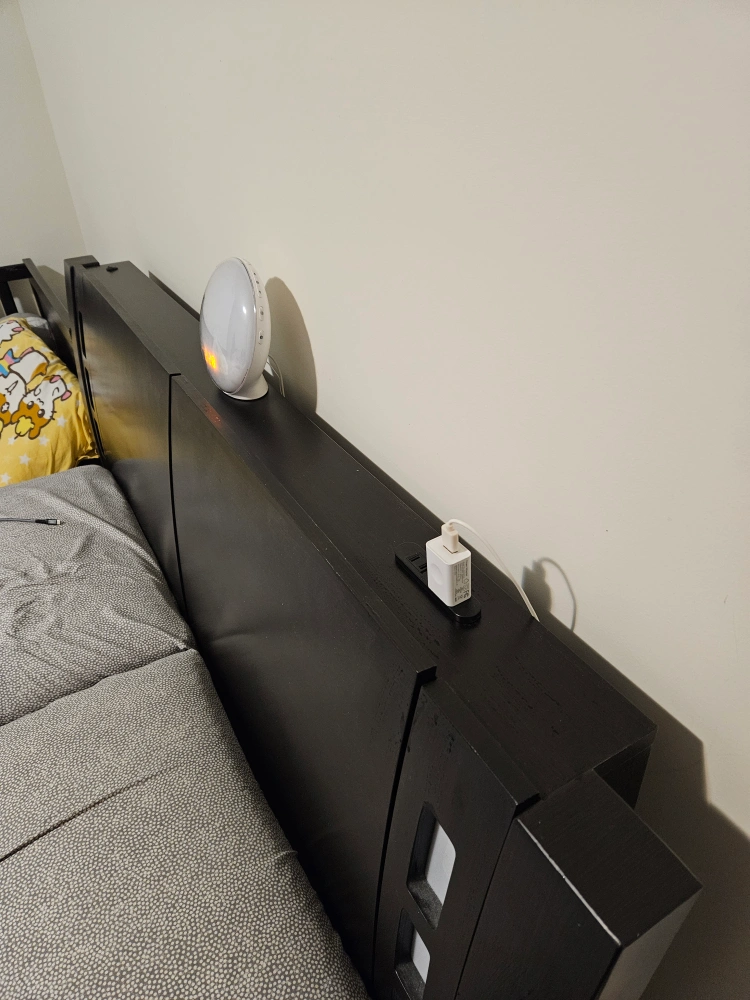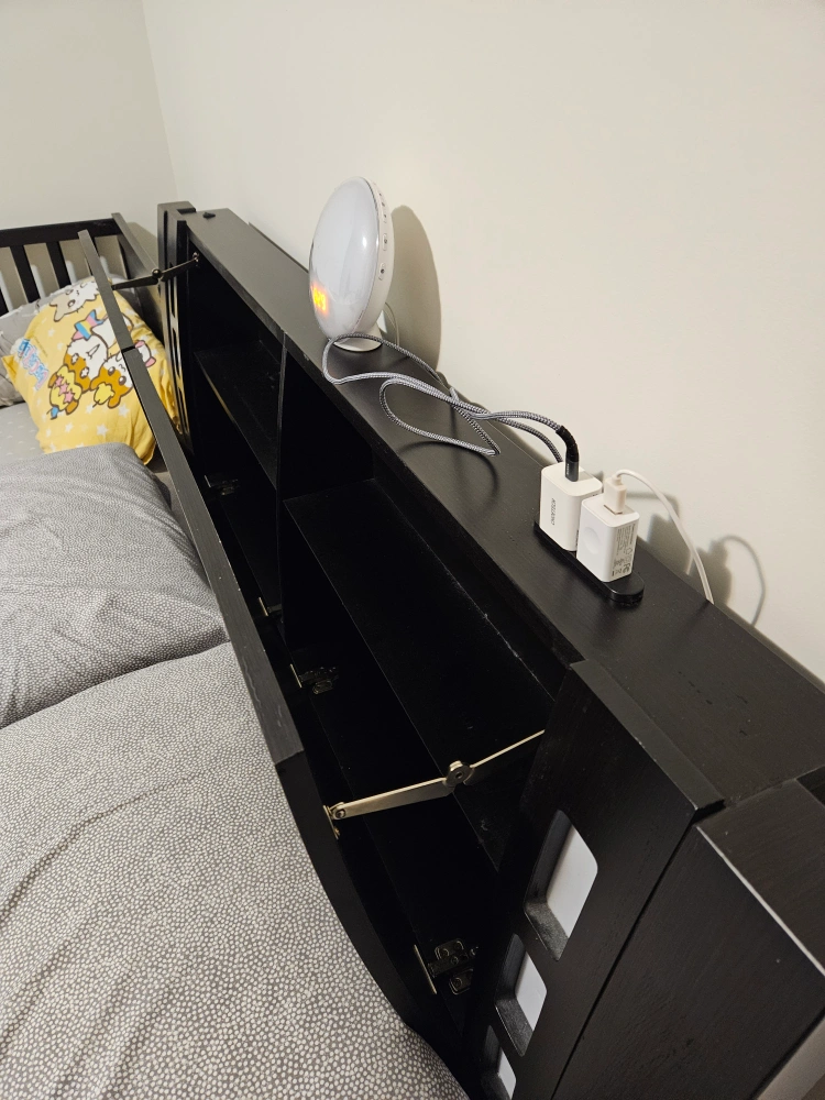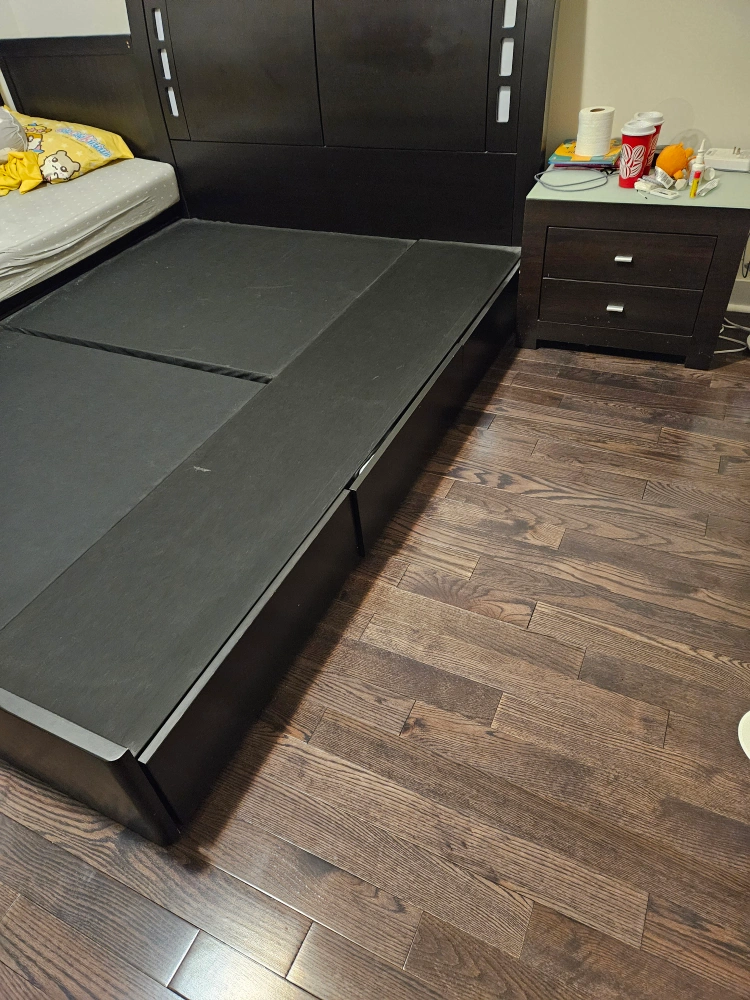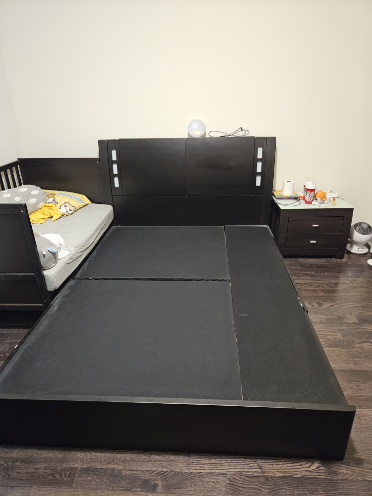Dark brown queen-size bed frame. Features built-in storage drawers and headboard with integrated shelving. Modern design, excellent condition.