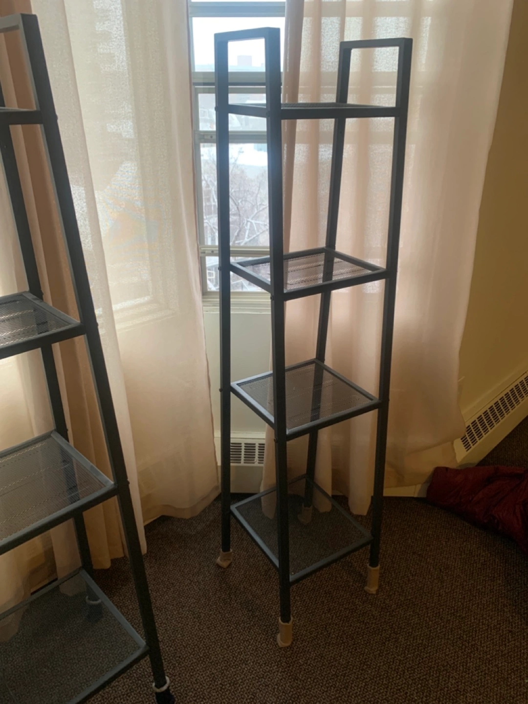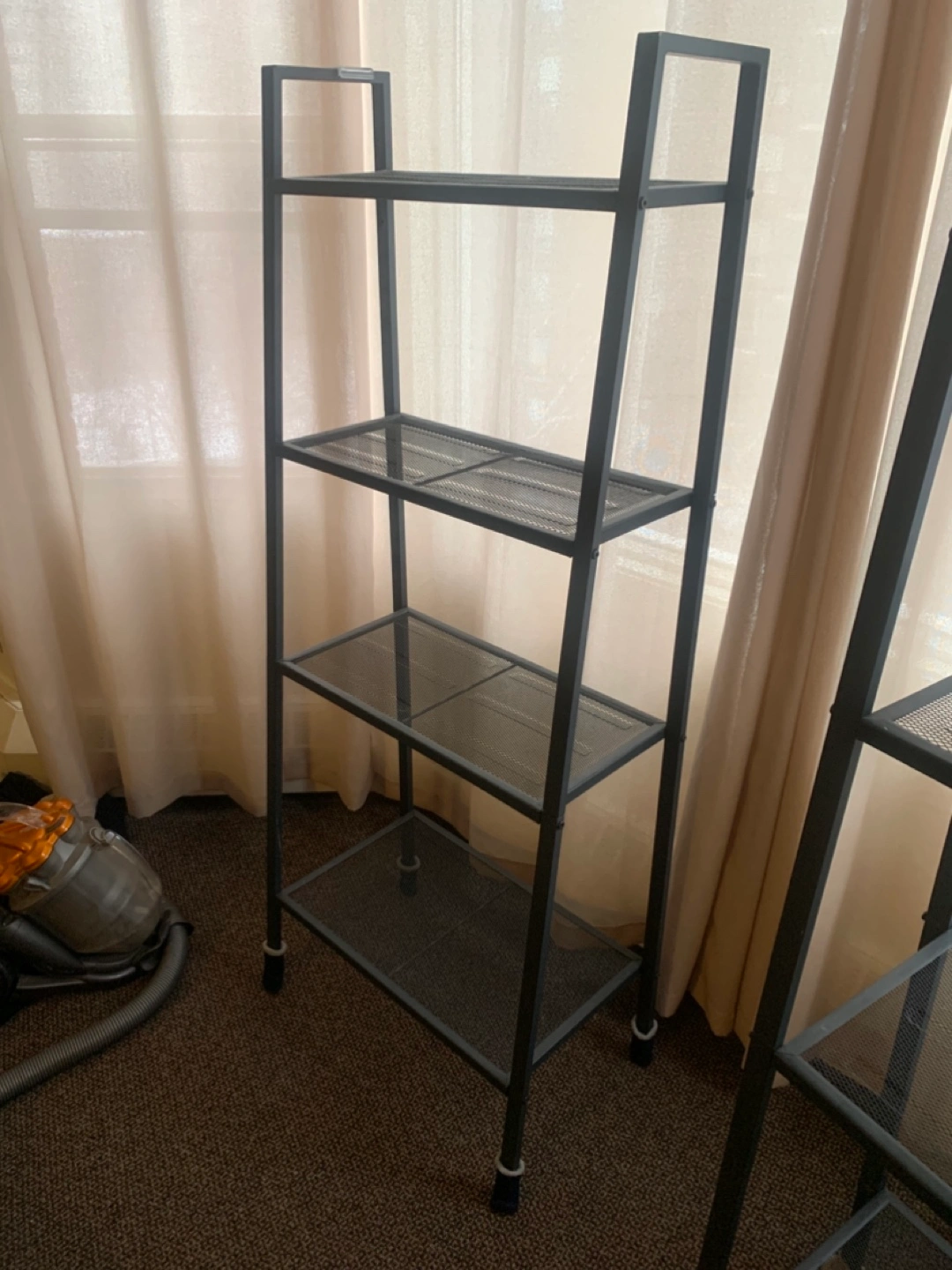 two dark grey metal shelves from ikea, one wider, one thinner. comes with cute little shelf “socks” :)