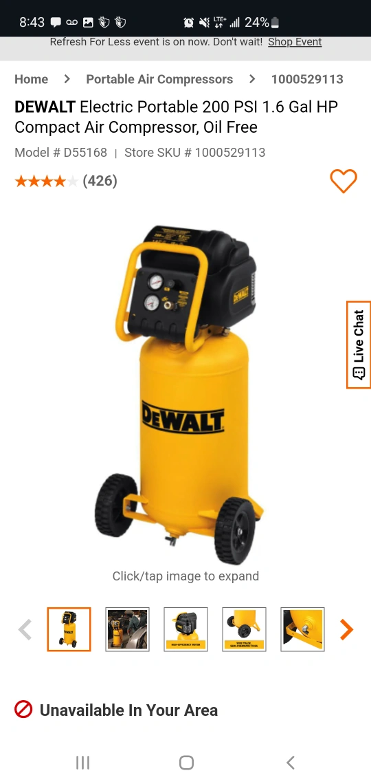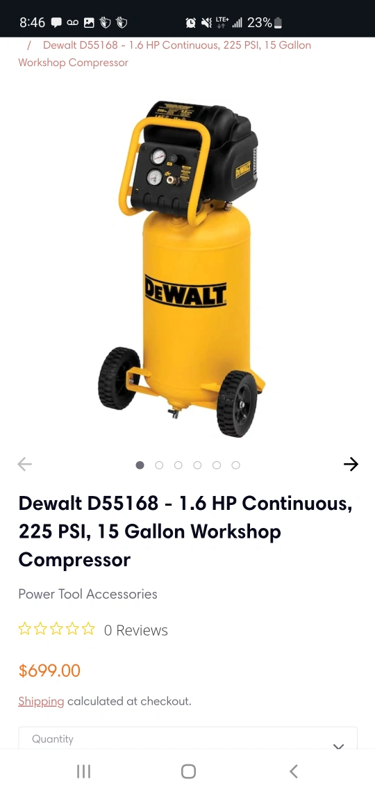 Dewalt 1.6 HP Continuous 225 PSI 15 Gallon Compressor