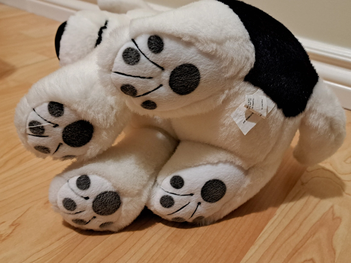 Adorable plush dog toy. Features white fur, black markings, and a red collar. Small tag with 'w.w.' on it. Collectible item, great for fans of classic cartoons.