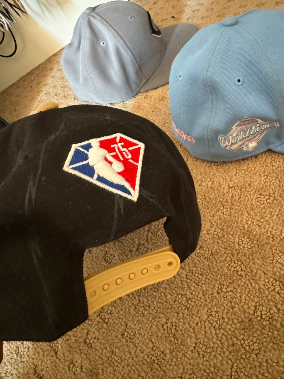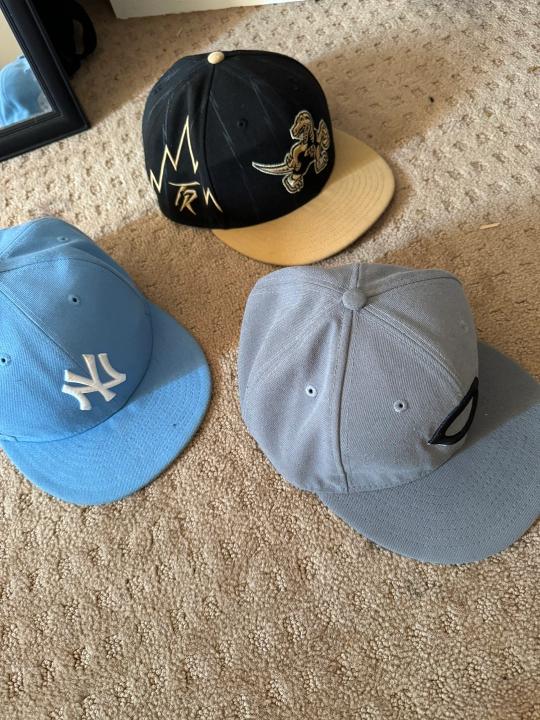 Five fitted hats, various colours and styles. Includes New Era and possibly other brands. Sizes vary.