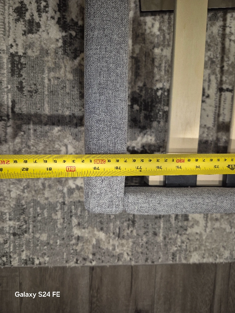 Double size bed frame. Grey fabric upholstery. Sleigh style headboard. Wooden slats included. Dark brown legs.
