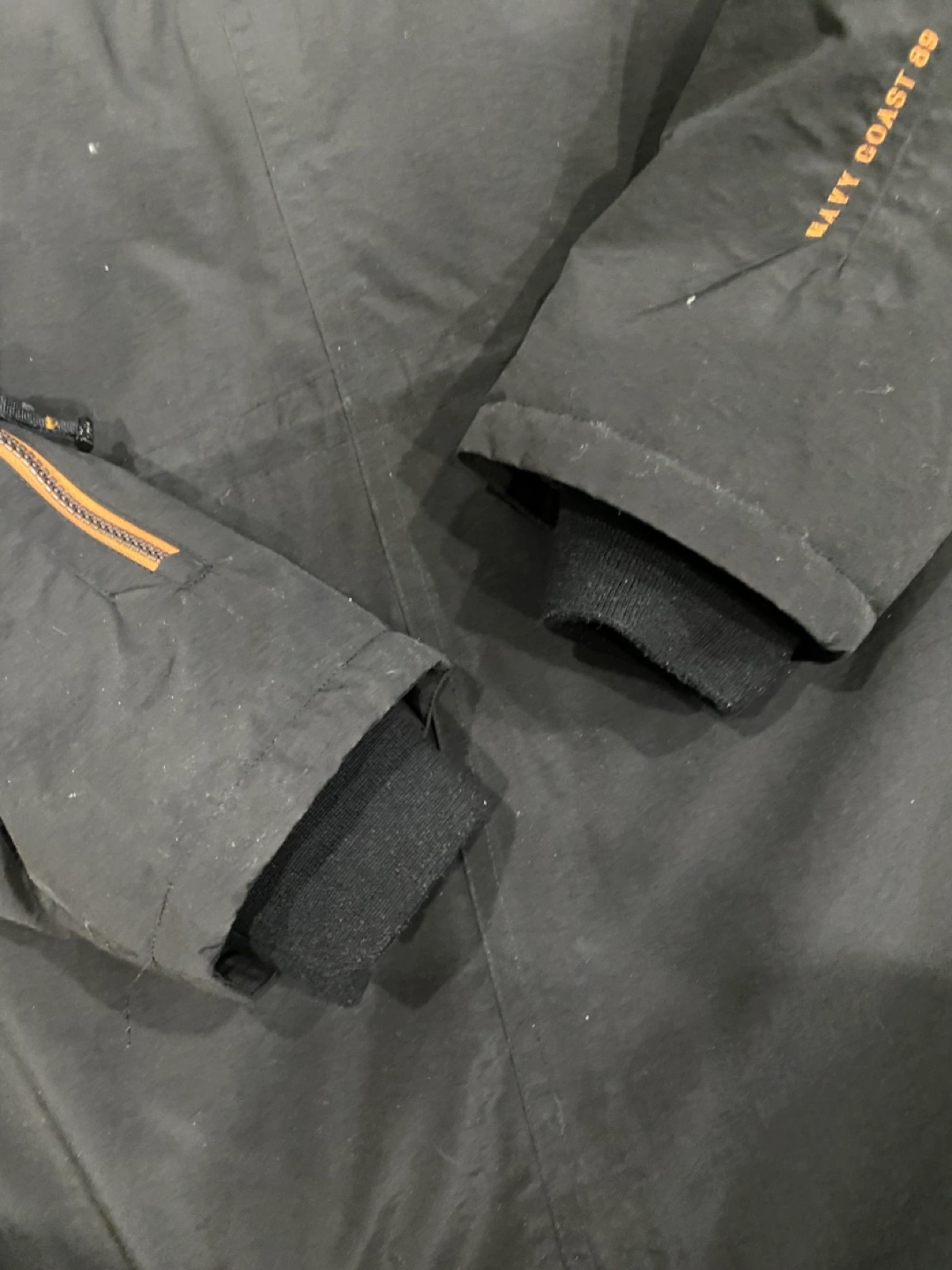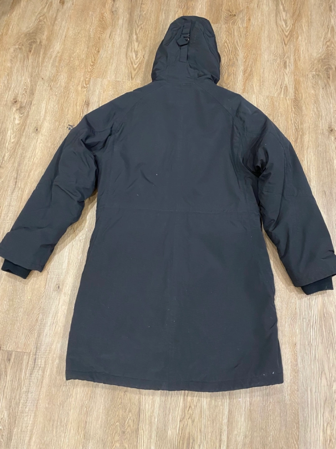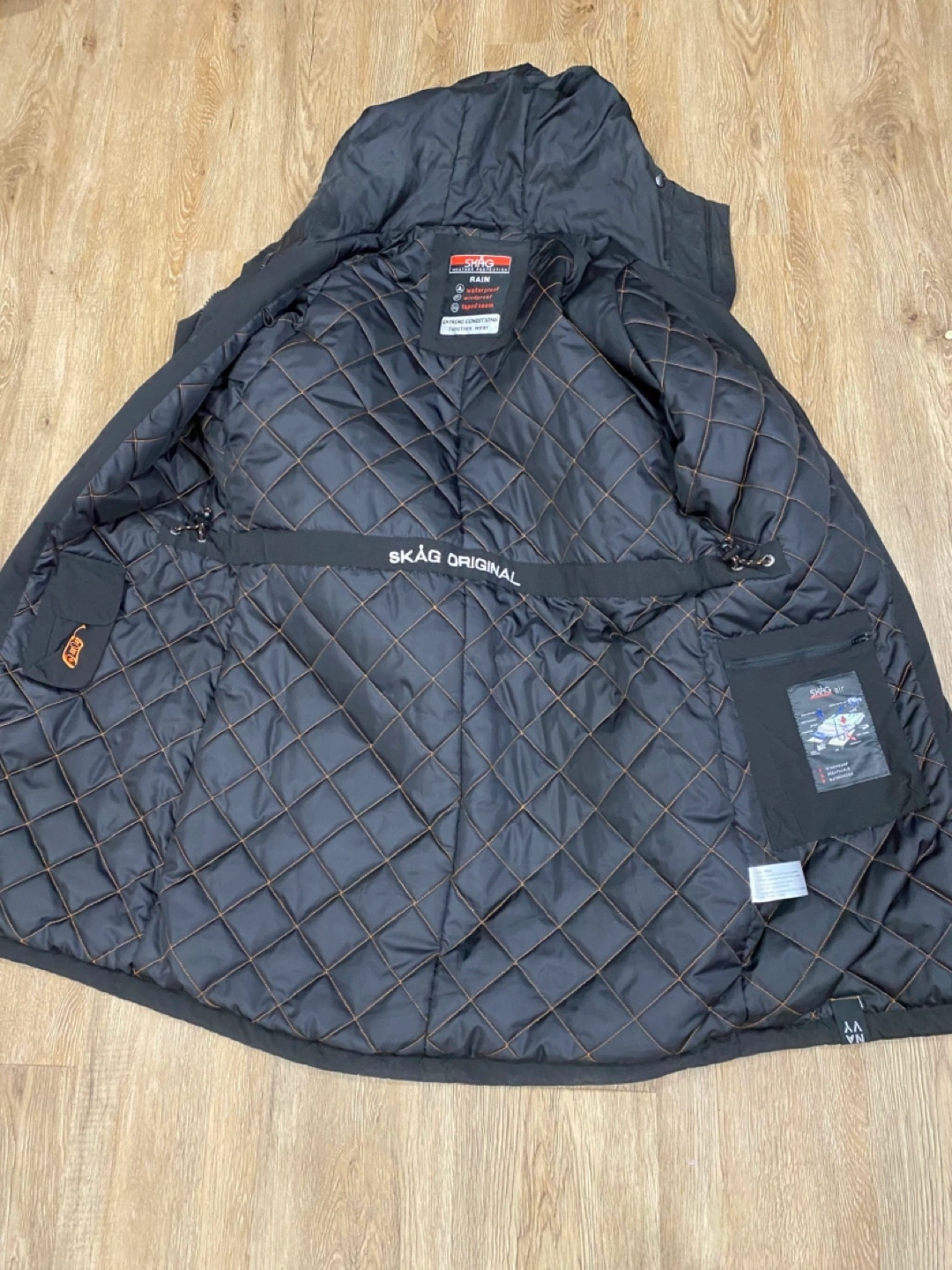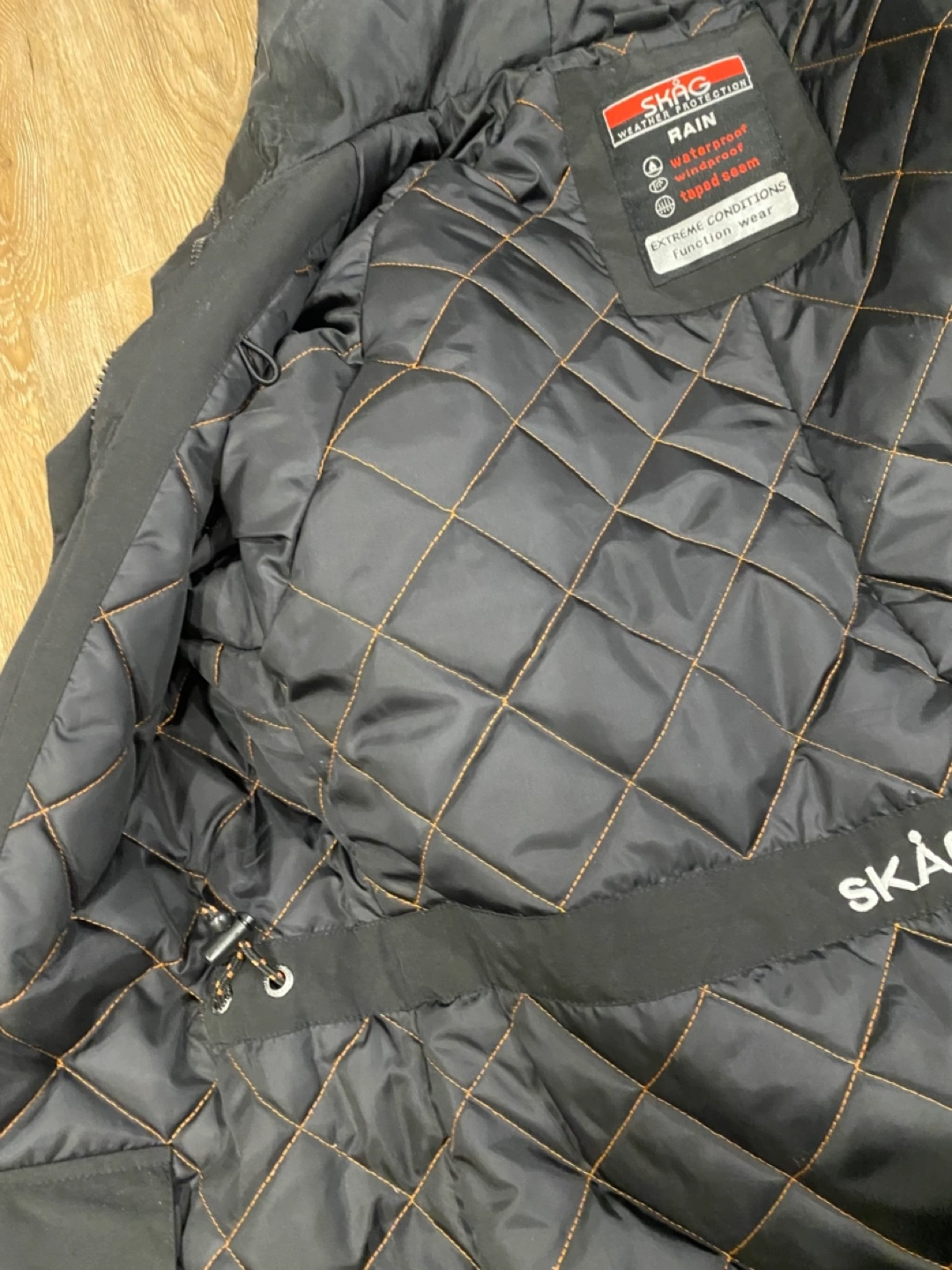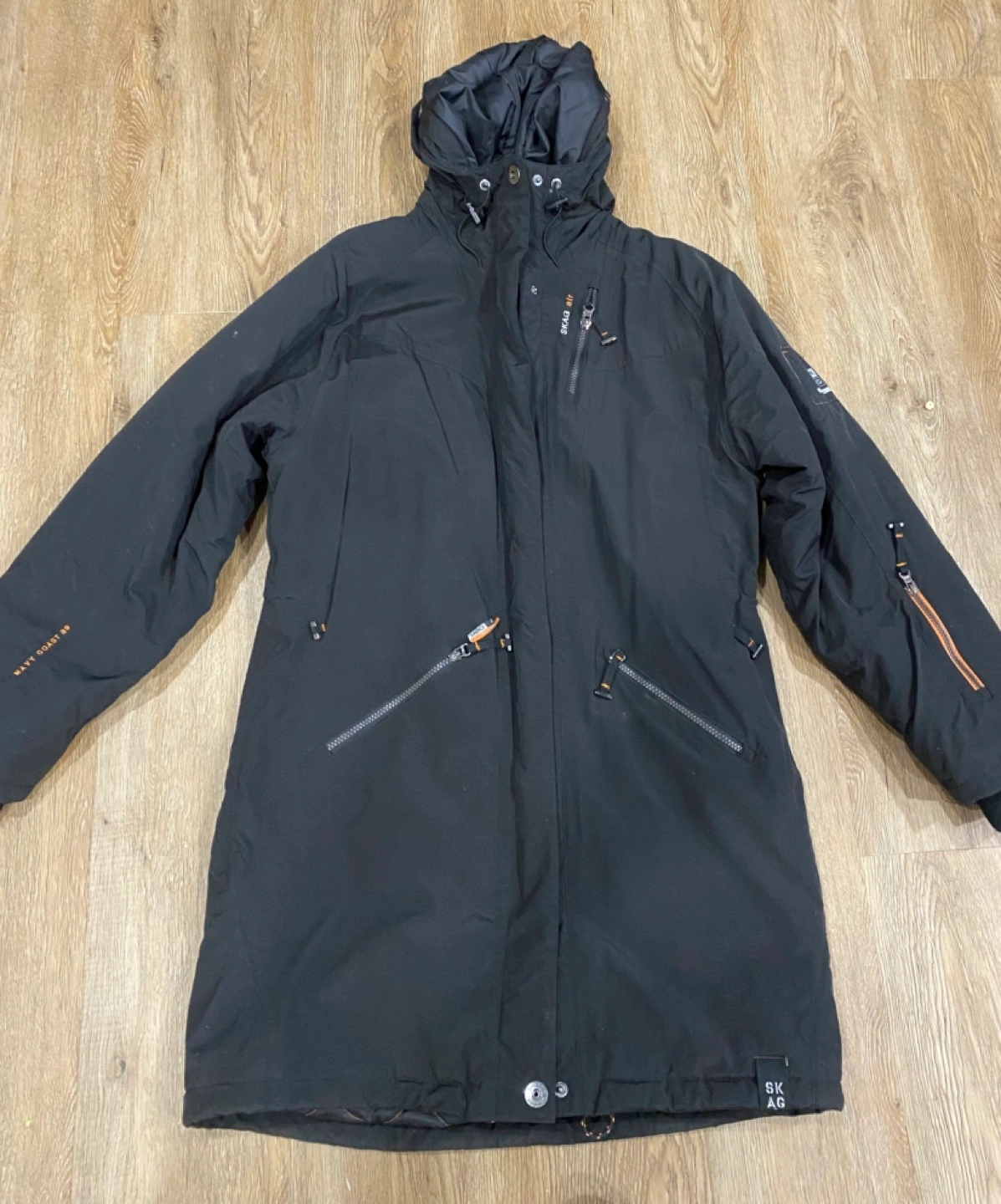 Skag Women's long black parka. Waterproof, windproof, taped seams. Features a hood and multiple pockets. Very durable hardware. Excellent for wet and cold weather conditions. Function wear. A loose fitting size small. Please refer to pictures for more details of style and condition.