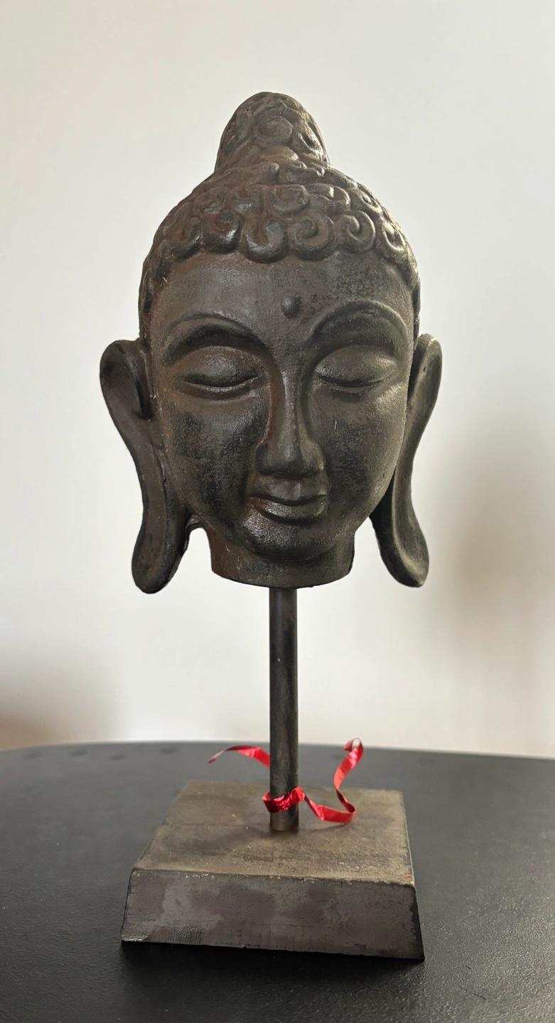 Dark grey/black coloured Buddha head statue. Intricate detailing. Mounted on a small dark stand. Perfect accent piece for a home or office.