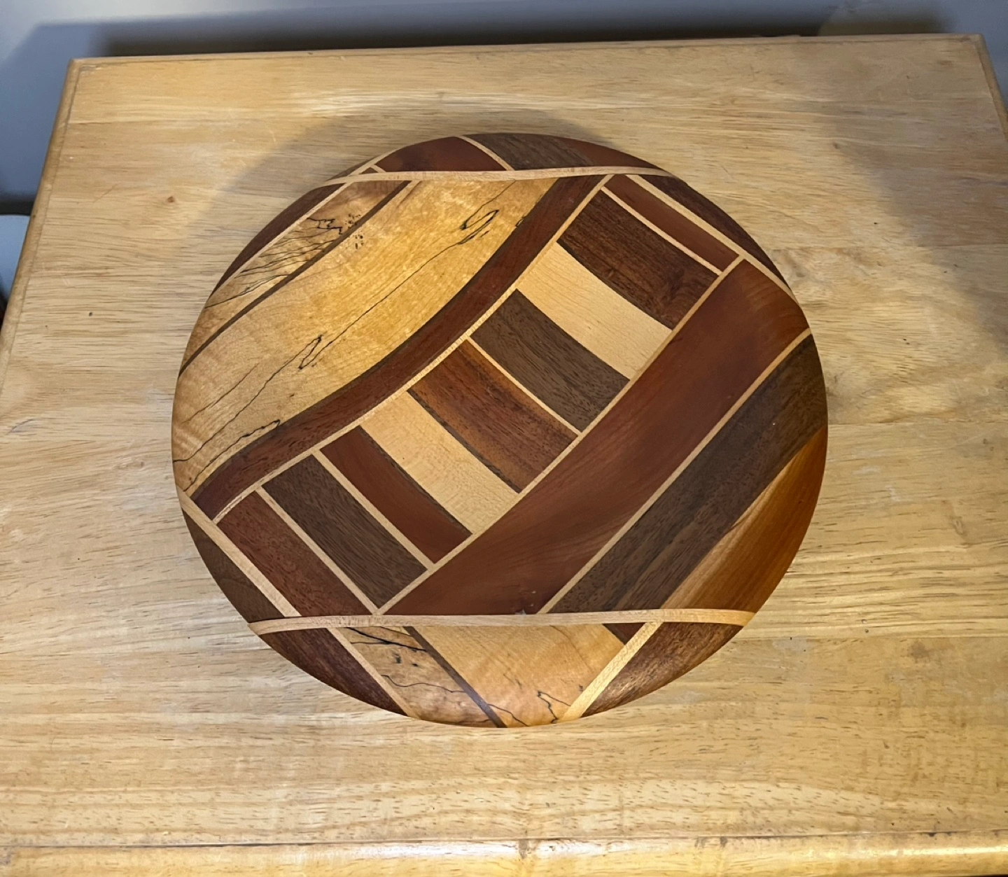 Beautiful handcrafted wooden bowl. Features a striking geometric design. Made from various hardwoods. Round shape, slightly concave. Unique piece for home decor. (Has a small separation see last picture)