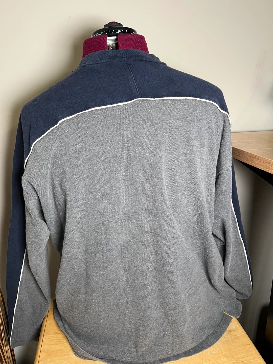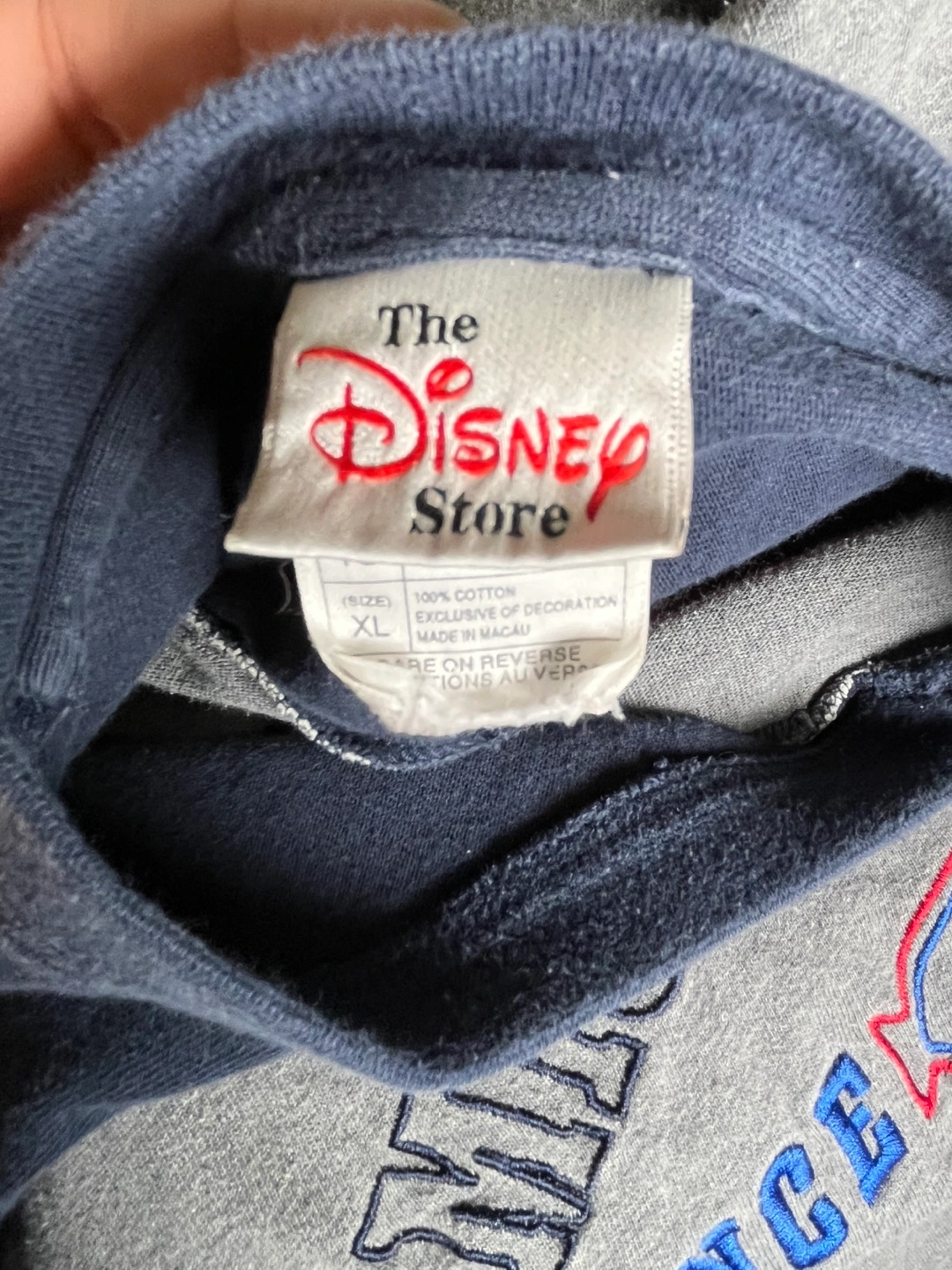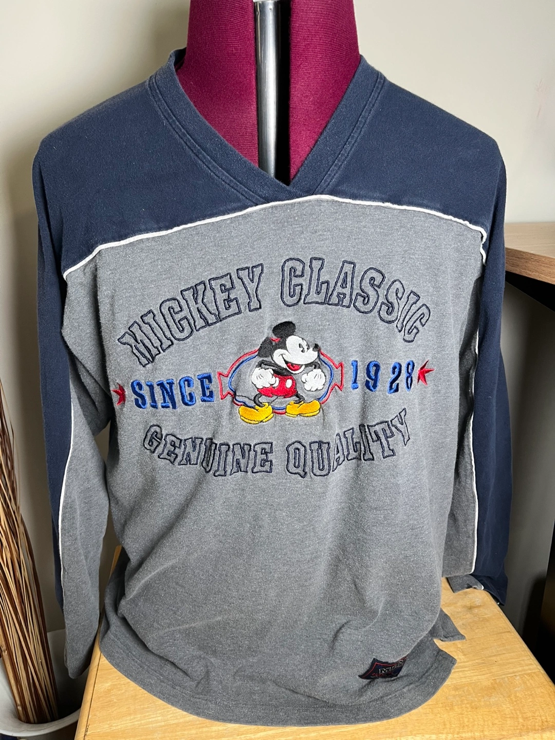 Grey and navy blue long-sleeve shirt. Features a vintage Mickey Mouse design. Embroidered details. Size XL. From The Disney Store.