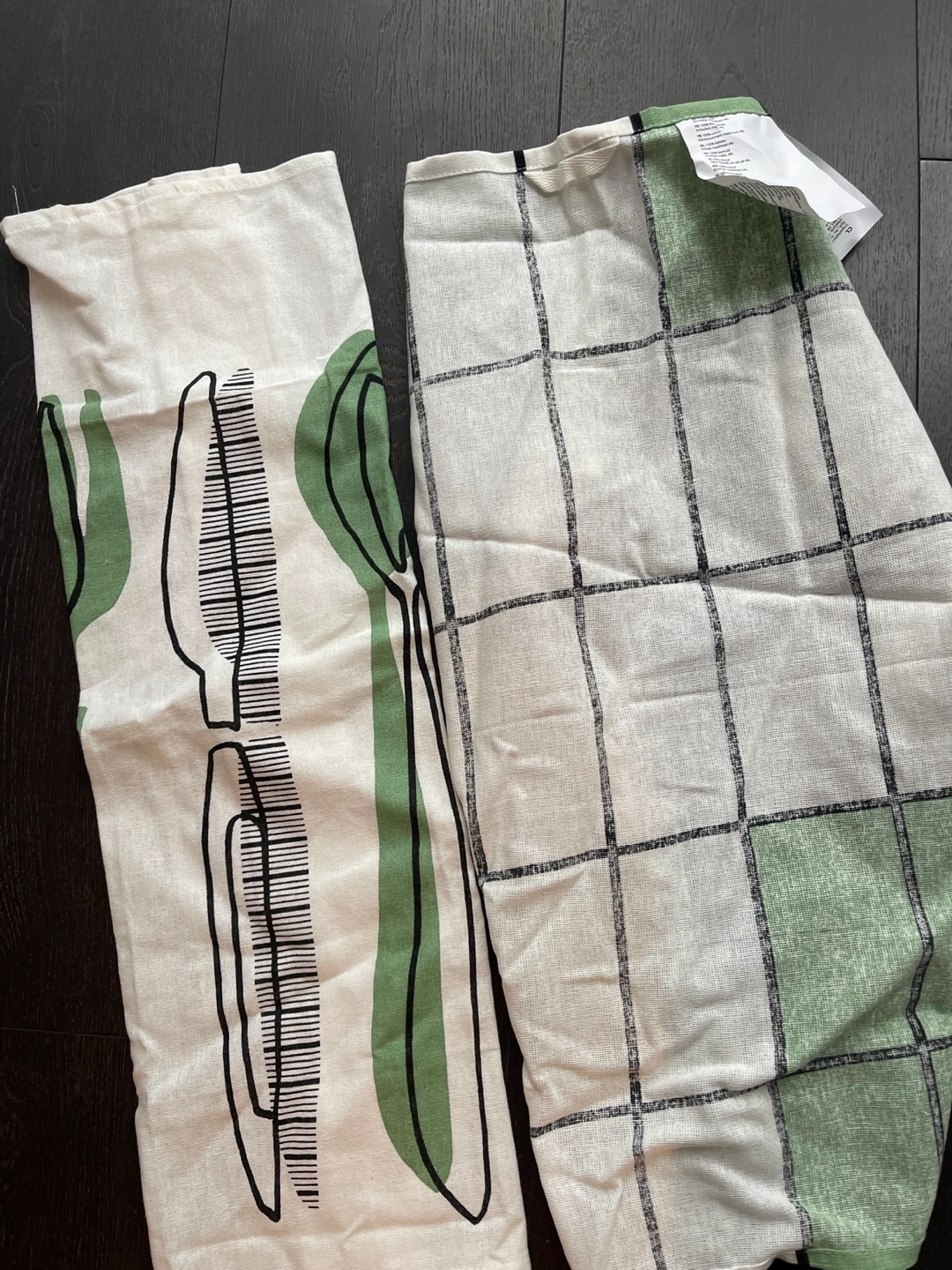 Two IKEA RÄNNIG tea towels. One features a cutlery design, the other a grid pattern. Cream coloured cotton with green accents. Machine washable.