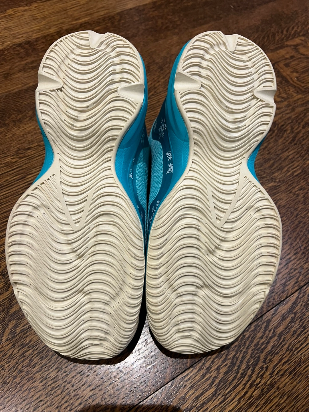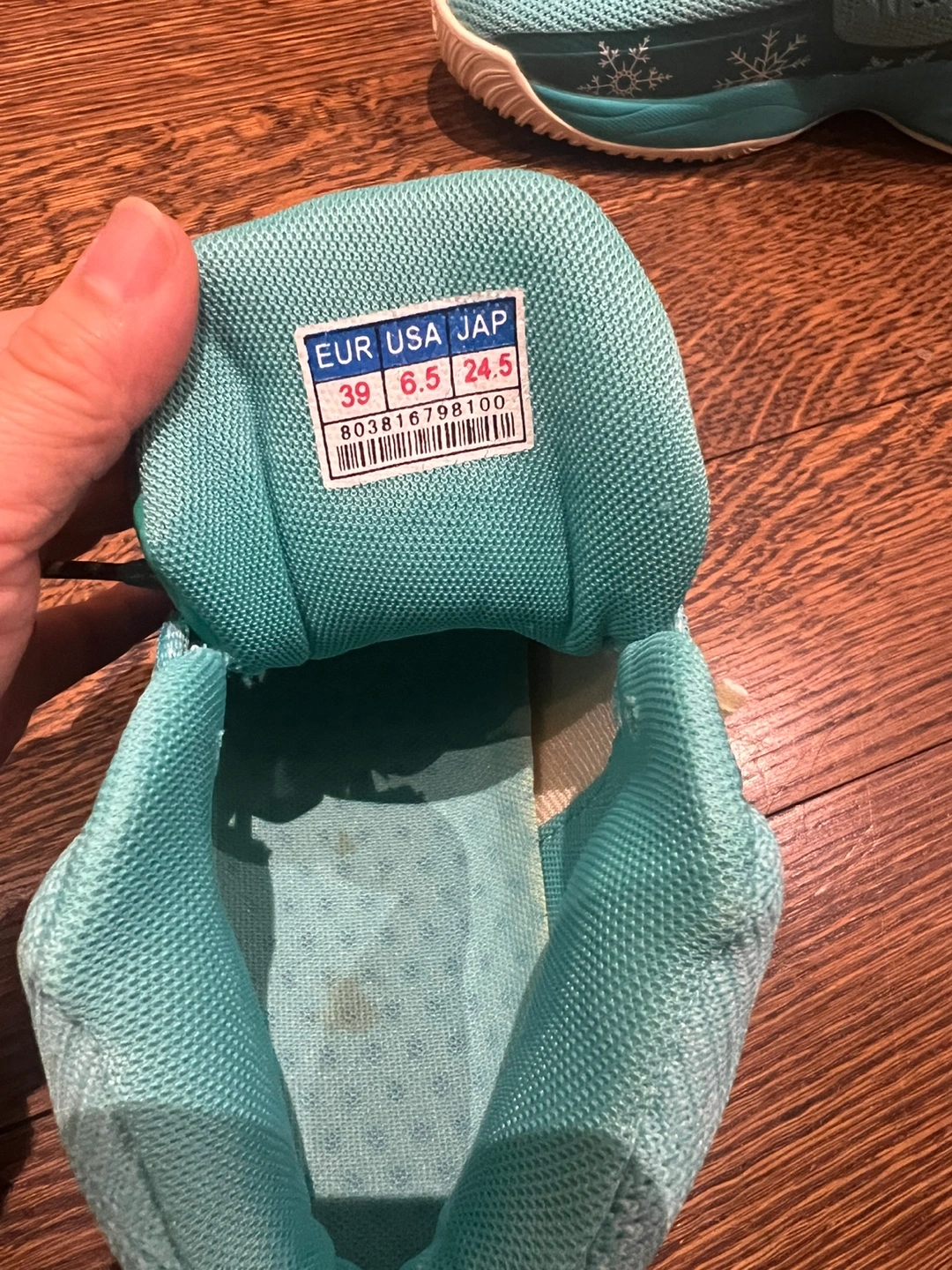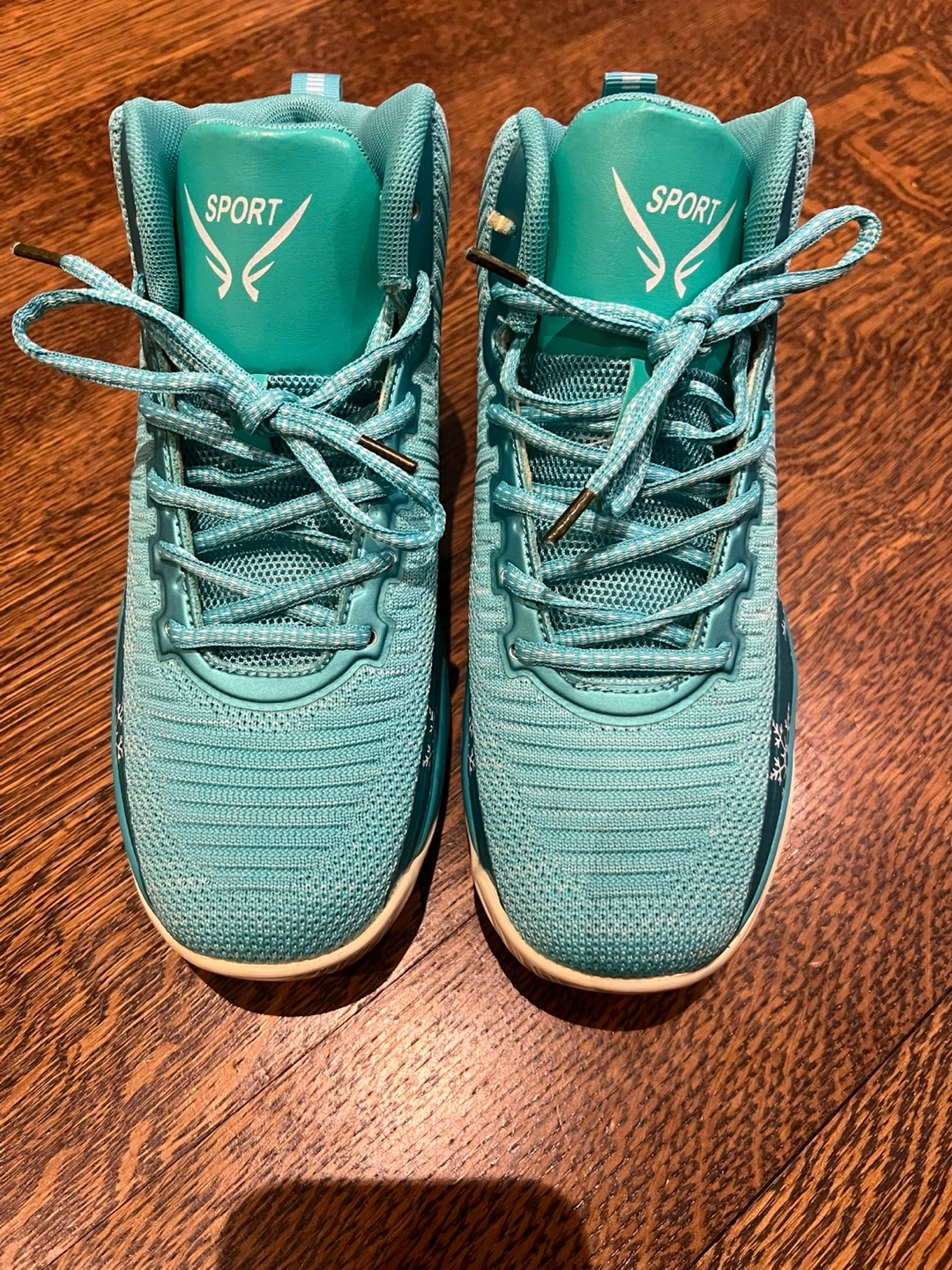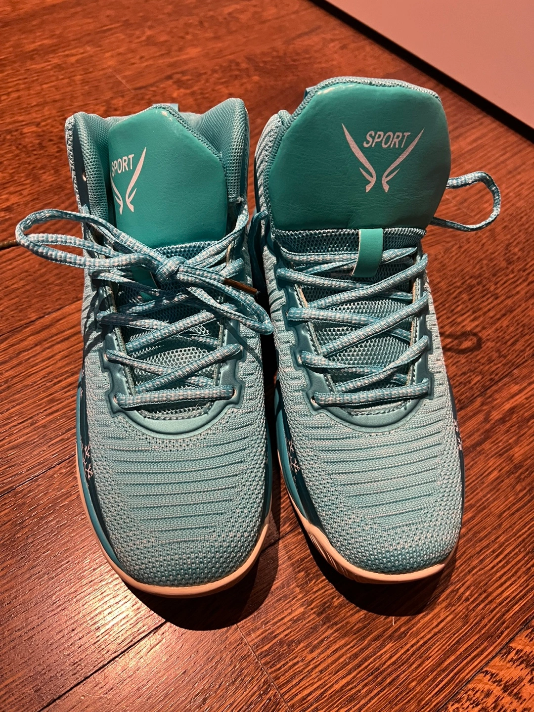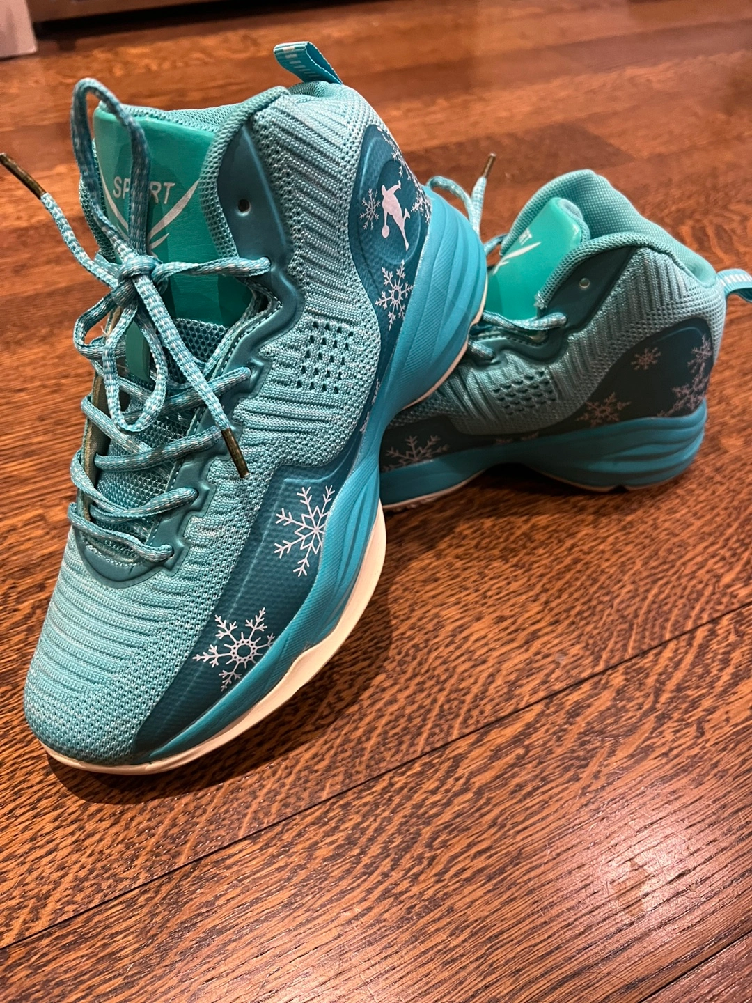 Brand New Lightly used Men’s/ teenager basketball shoes. Teal colour with snowflake design. Size 6.5 US. High-top design. Lace-up closure.