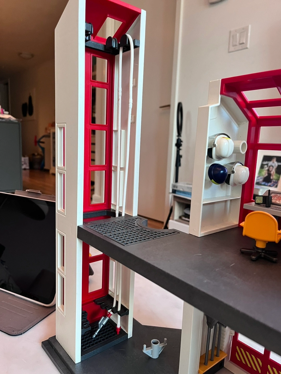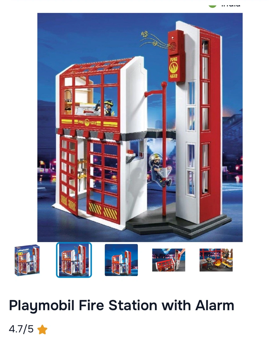 Playmobil fire station. Includes two firefighters. Features multiple levels, a control room, and storage space. All accessories on last picture, included plus fire hose. Alarm makes a sound.