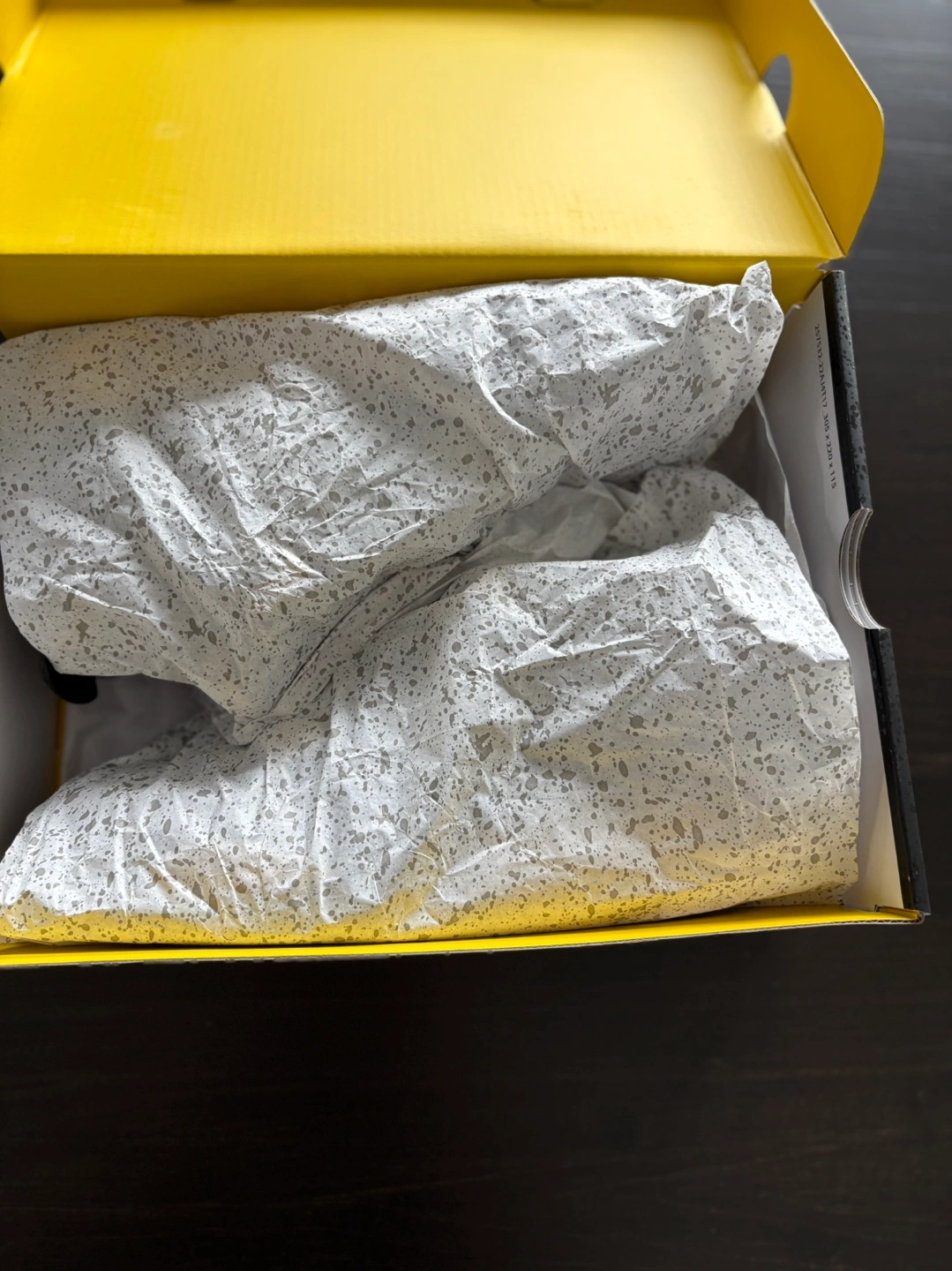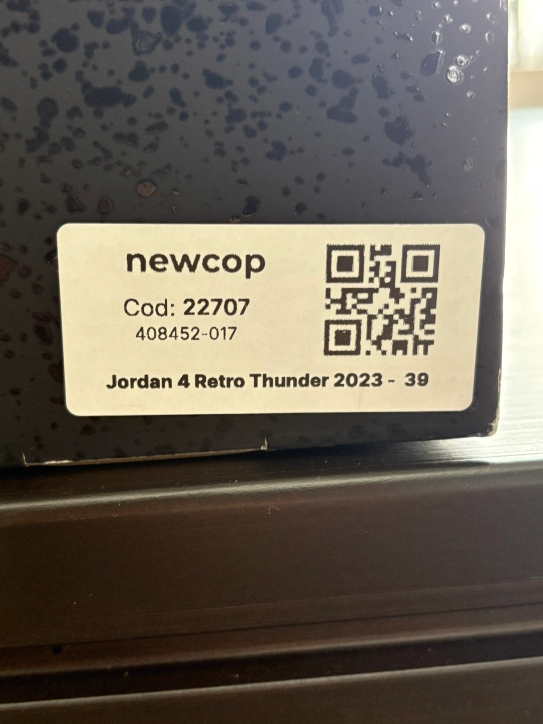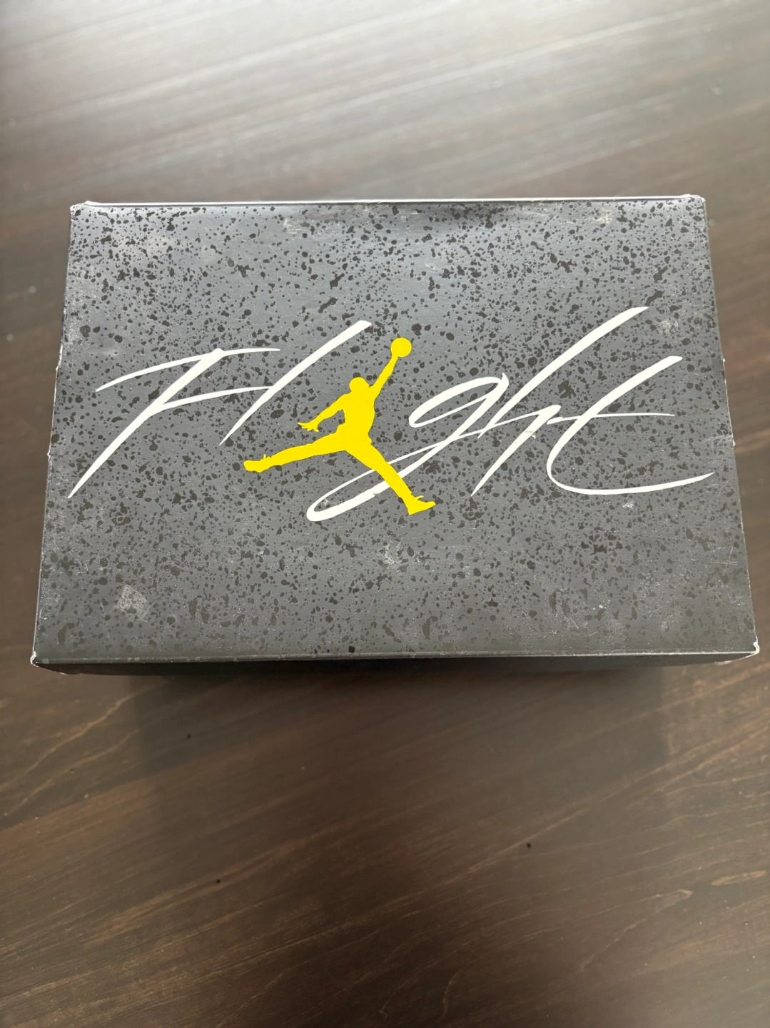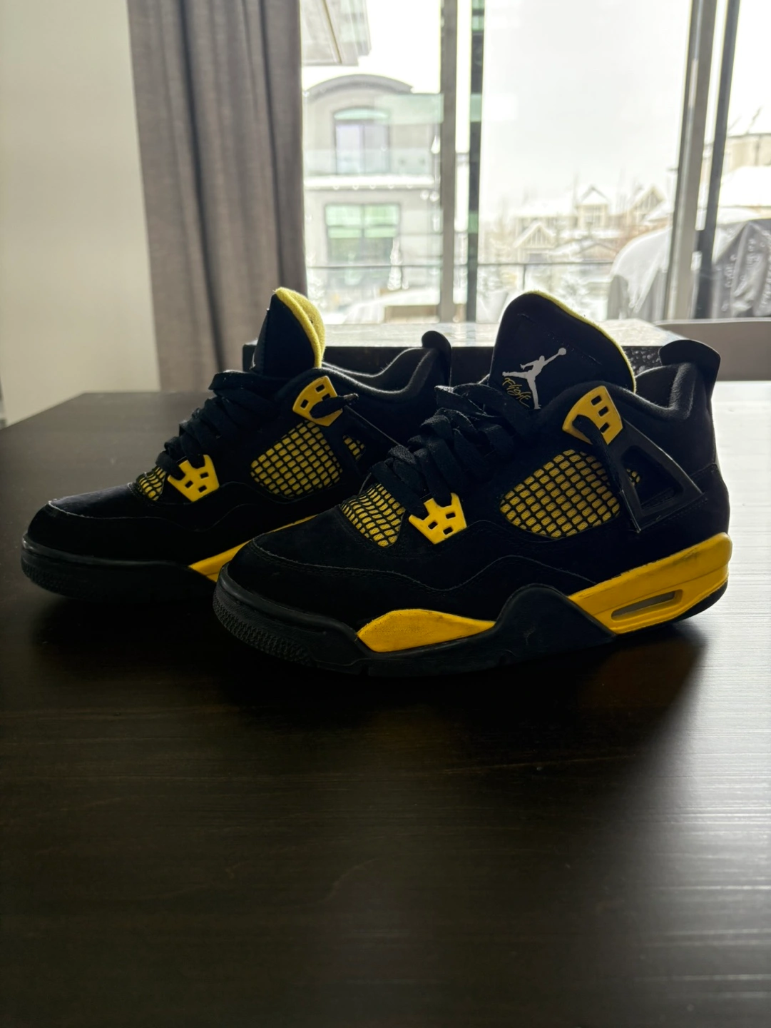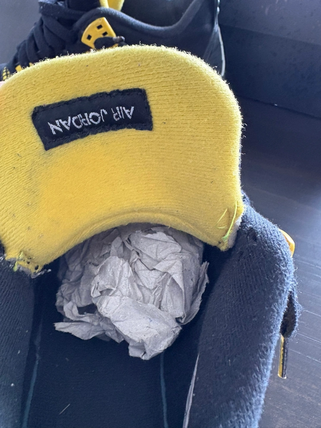 Women's Air Jordan 4 Retro GS in black and yellow. Size 6.5Y. Pre-owned, some wear. Made in Indonesia.